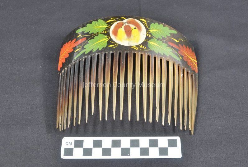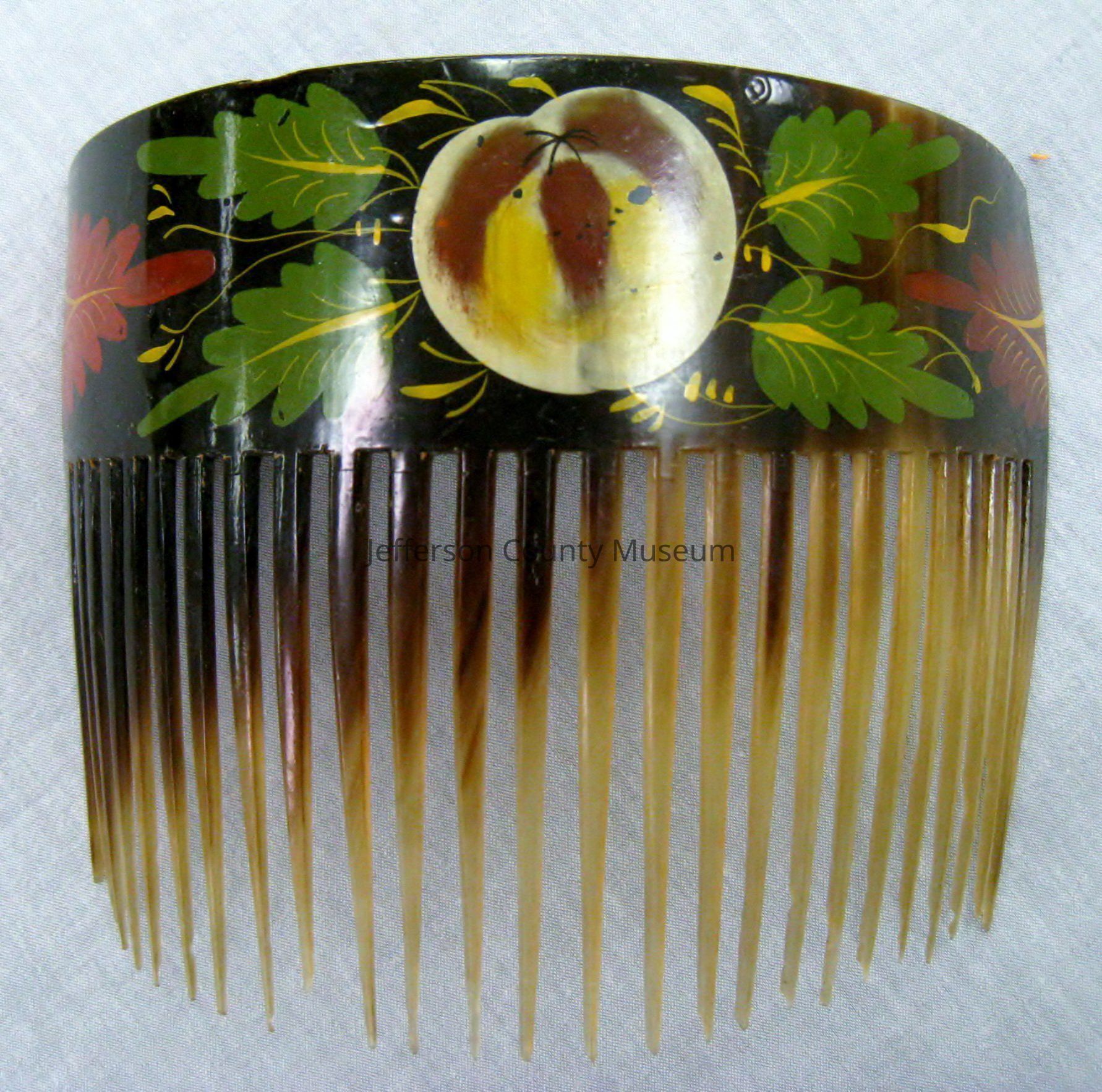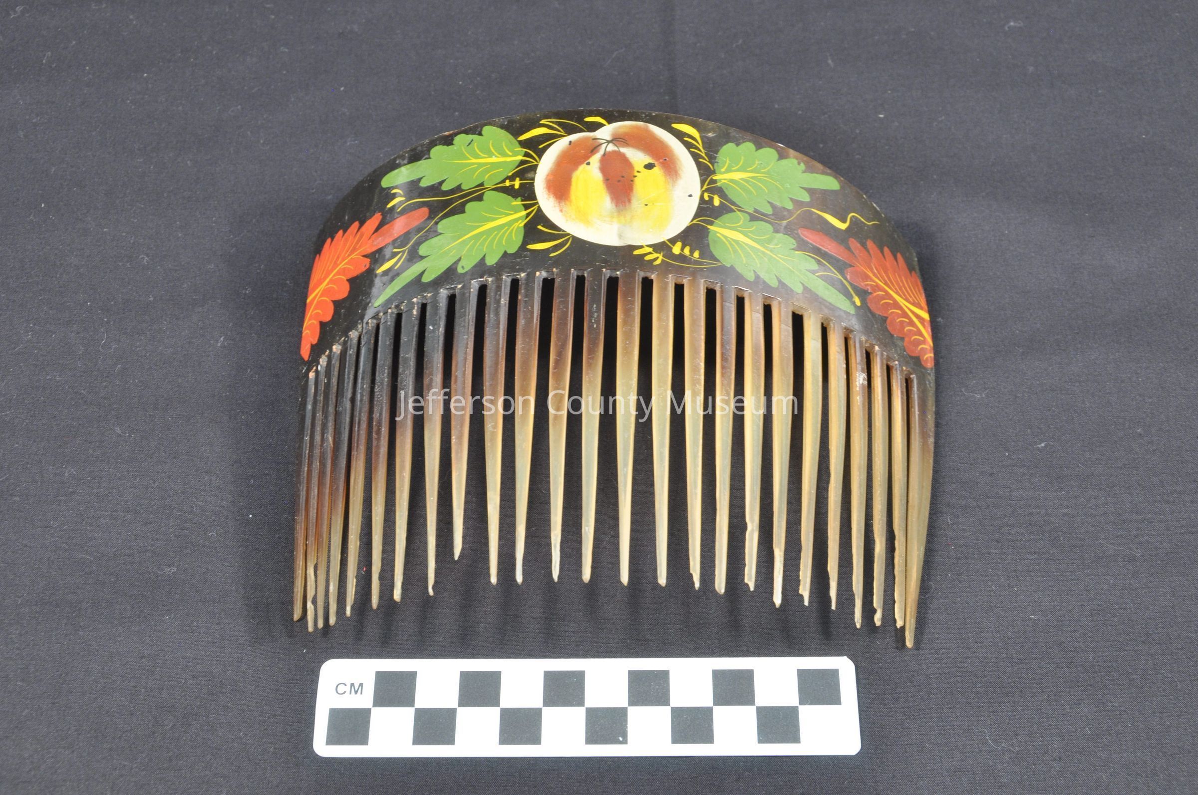 Large tortoise shell ornamental comb. Painted in manner of Tole decorators of the mid-19th century. Painted with fruit and leaves motif of red, green, etc.Acquisition