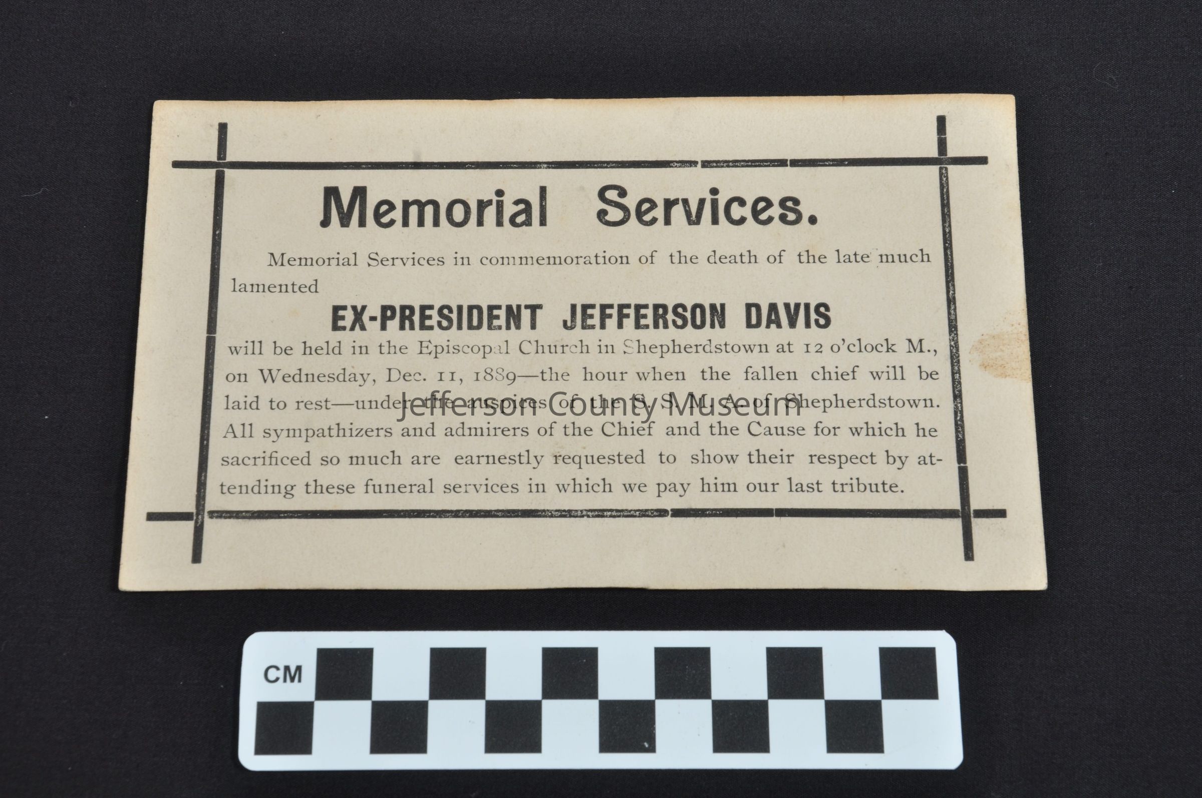 Announcement says "Memorial Services. Memorial Services in commemoration of the death of the late much lamented EX-PRESIDENT JEFFERSON DAVIS will be held in the Episcopal Church in Shepherdstown at 12 o'clock M., on Wednesday, Dec. 11, 1889--the hour when the fallen chief will be laid to rest--under the auspices of the S.S.M.A. of Shepherdstown. All sympathizers and admirers of the Chief and the Cause for which he sacrificed so much are earnestly requested to show their respect by attending these funeral services in which we pay him our last tribute." Thin black border around announcement.Acquisition