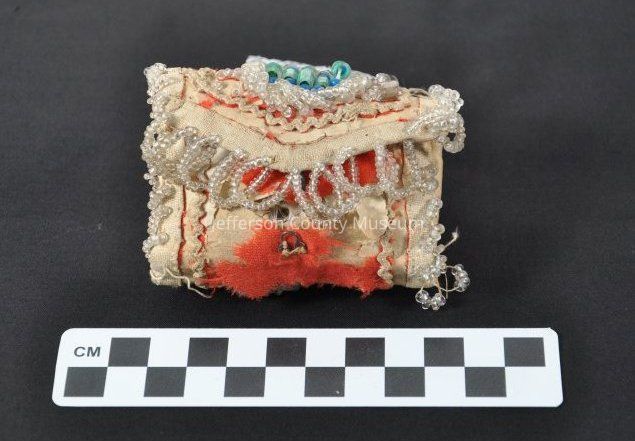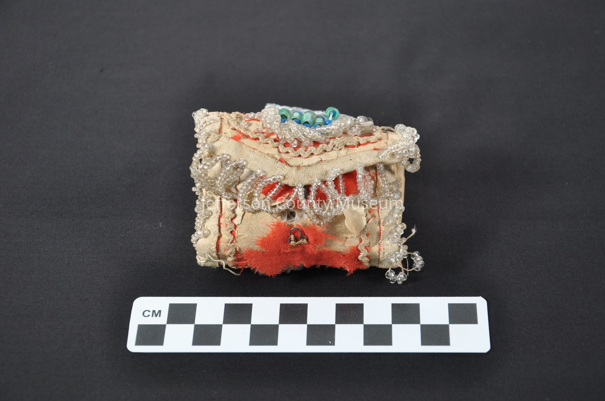 Beaded pincushion that folds over and fastens with a hook and eye. The red cloth on the outside has mostly worn away. The lining is pink, as is the cushion. The beading consists of clear round beads, blue round beads, gray cylindrical beads, green cylindrical beads, brownish-gray cylindrical beads. The inner pocket contains 4 pink and 7 gray cylindrical beads and some grey button thread. The pincushion is now mainly white on the outside with some rick-rack edging.Acquisition