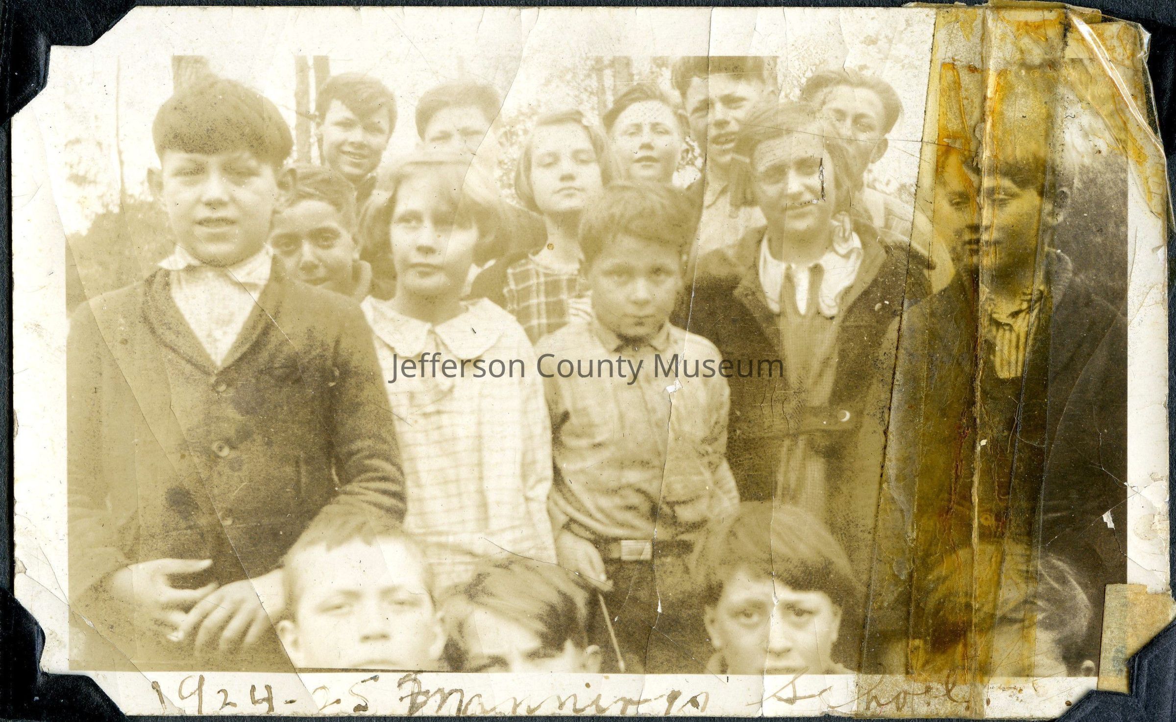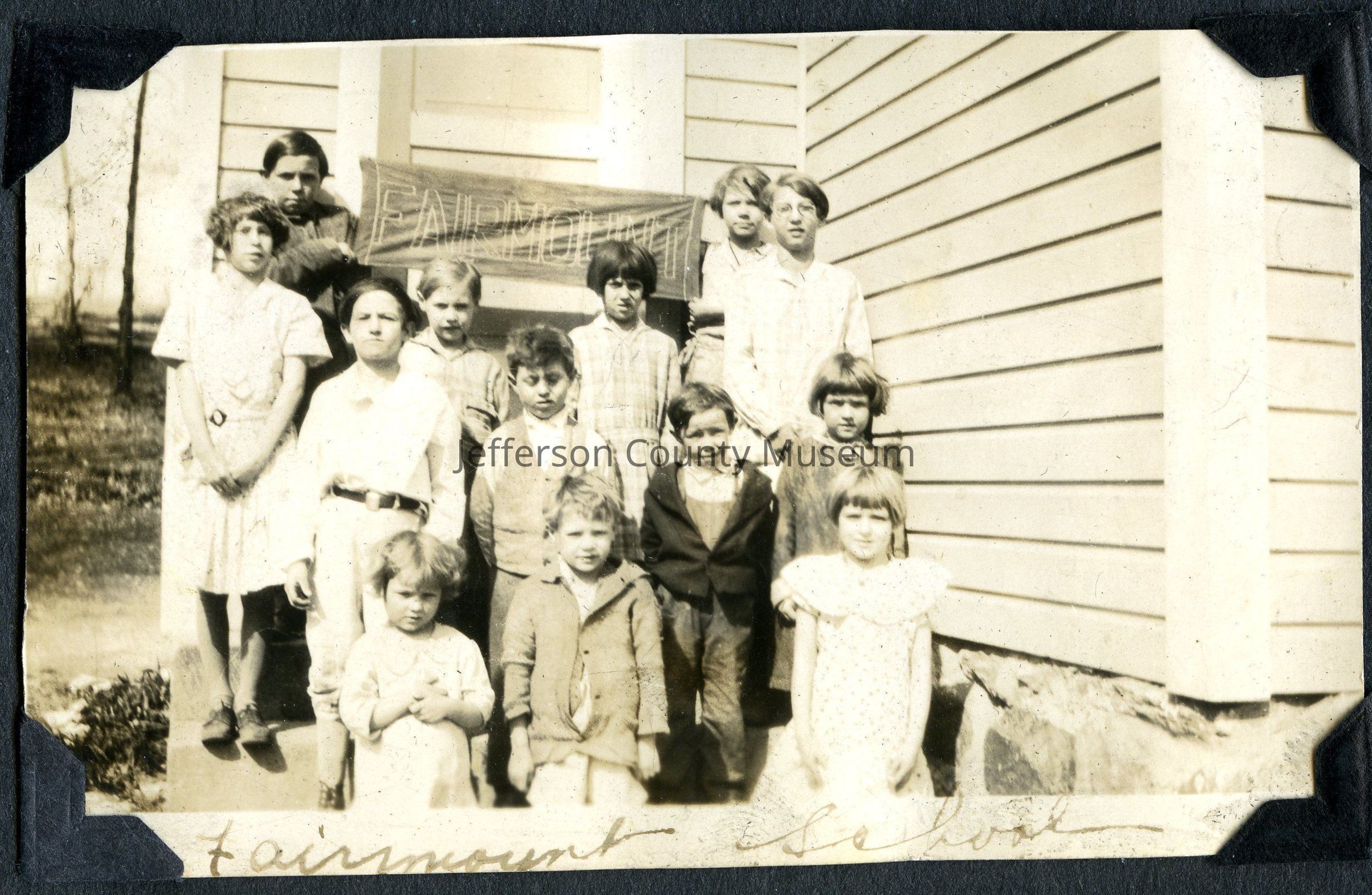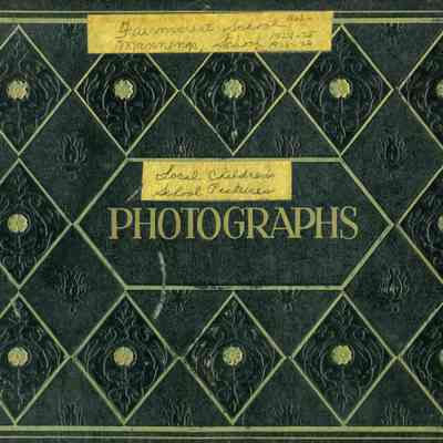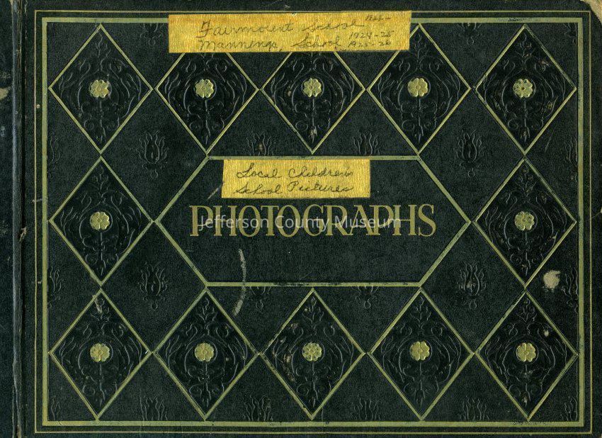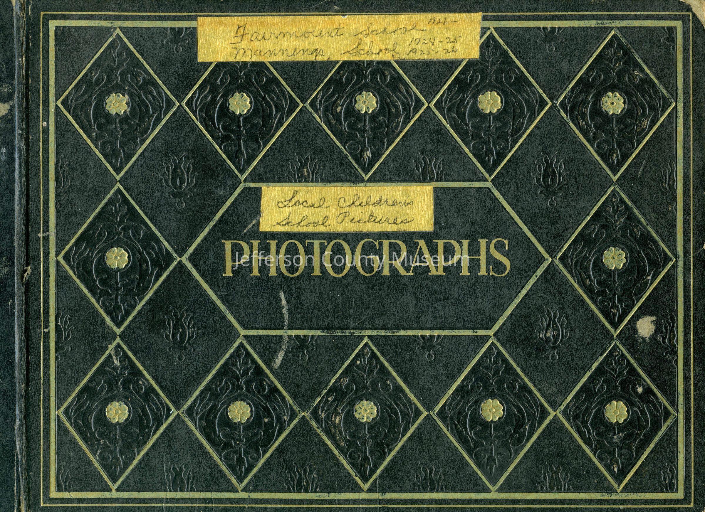 Thirty page black photo album with diamond design on cover and tied with black string of local children's school pictures collected by Marianna Johnson Smallwood, a local school teacher. Entitled "Fairmount School 1926-, Mannings School 1924-25, 1925-26." Both schools were on the Blue Ridge mountain, east of the Shenandoah.