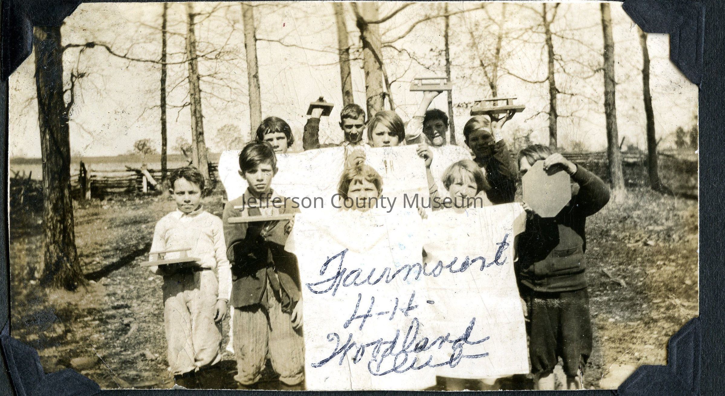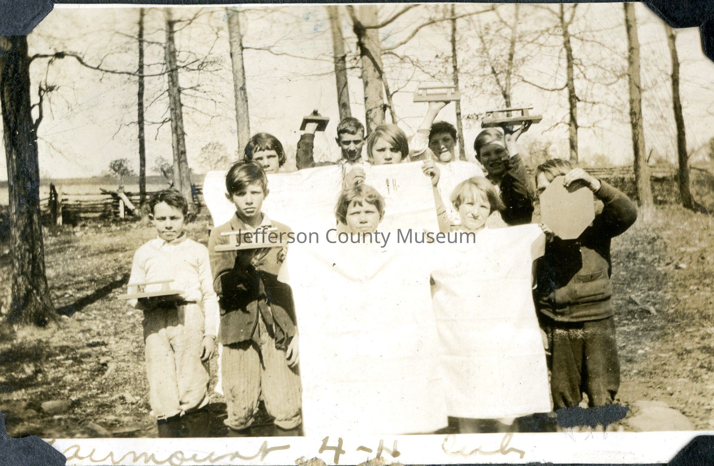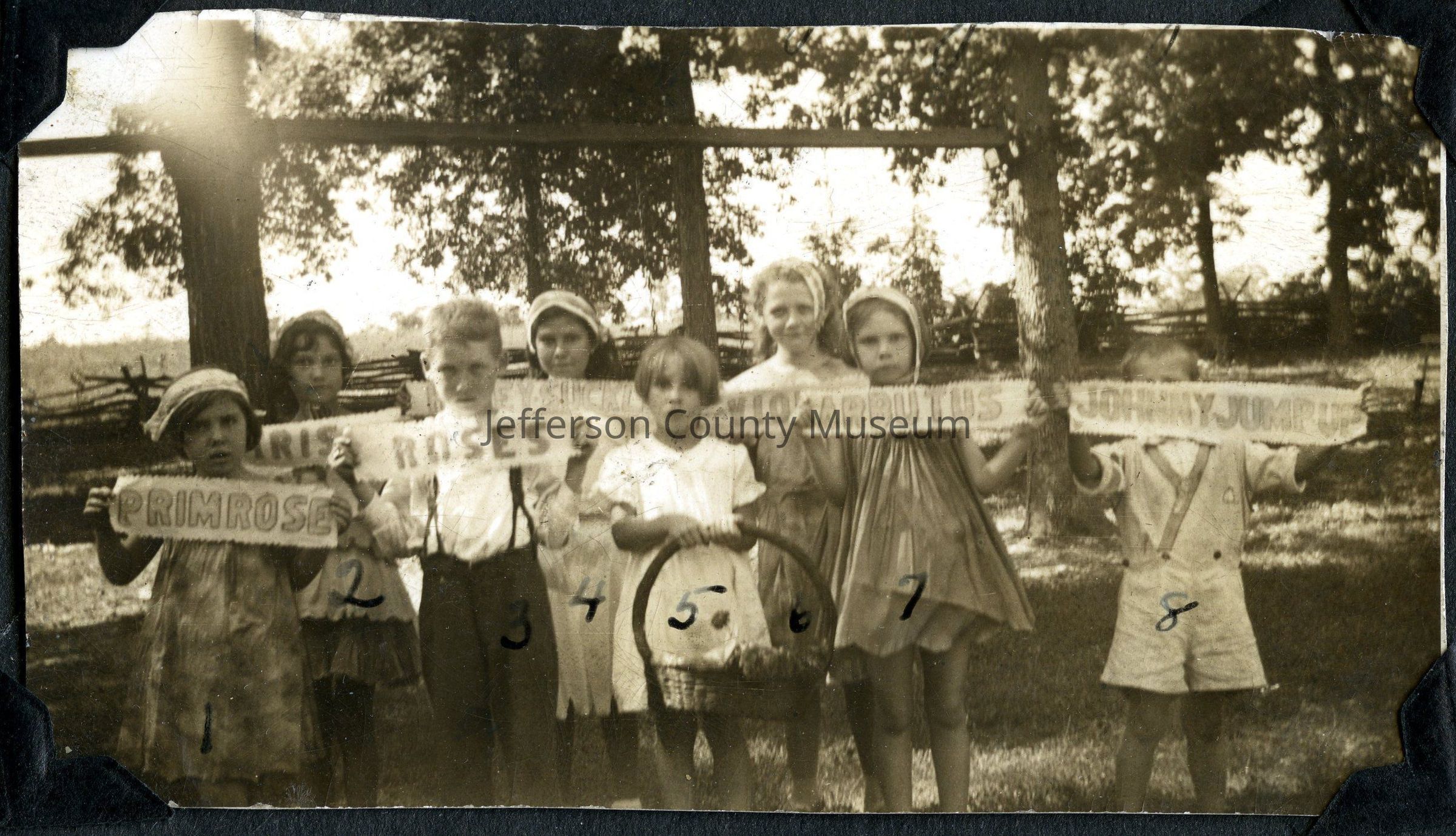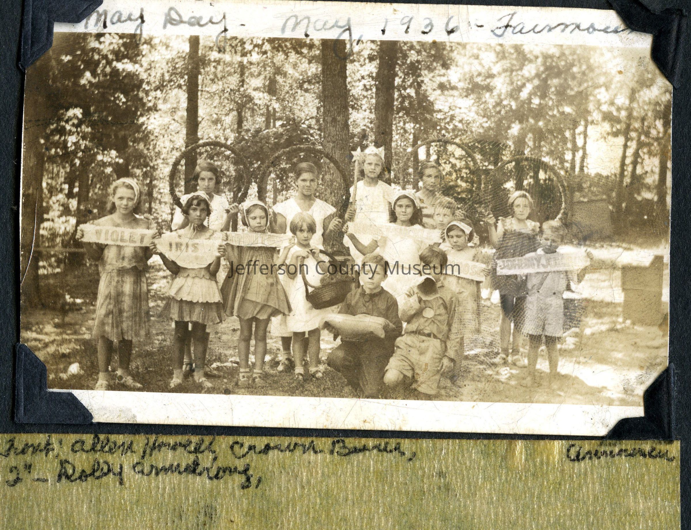 3. 8 children from Fairmount School holding signs with plant name, May Day 1936 (unknown, Juanita Gaynor, John Brown, Beulah Mobley, Evelyn Mason, Dolly Armstrong, Cora Armstrong, Charles Dillow)(names on back of photo scanned in Media as ARC648-50)