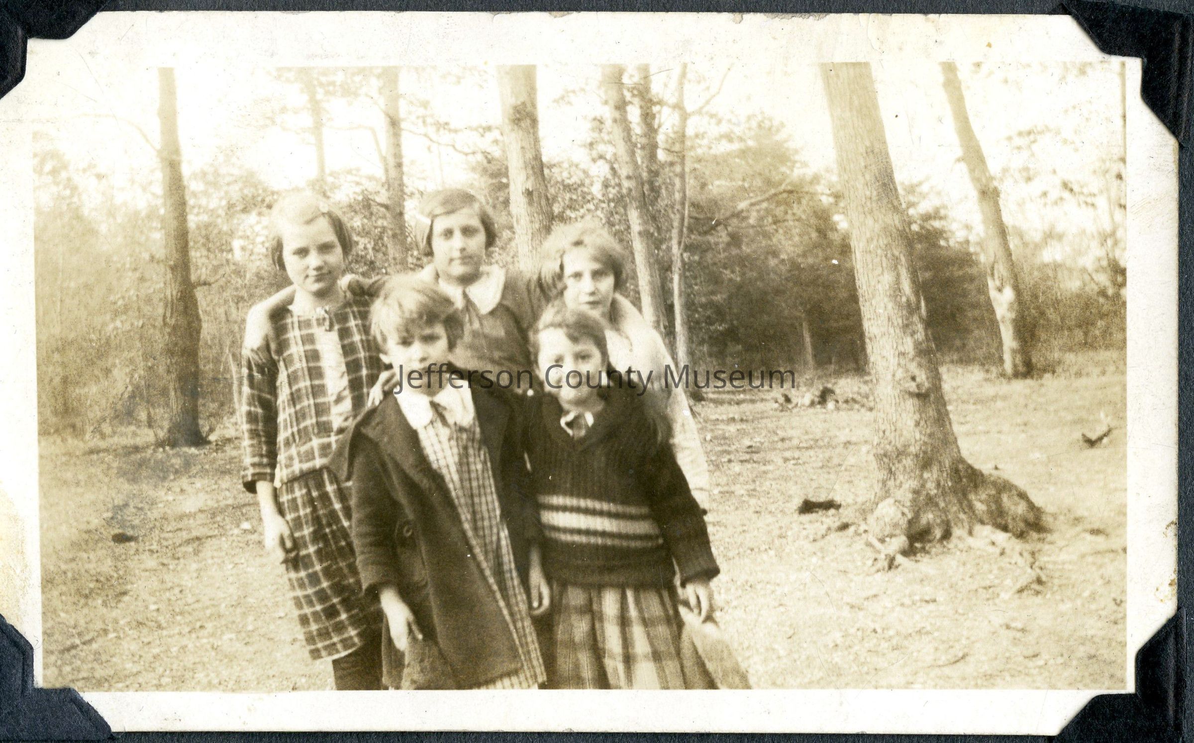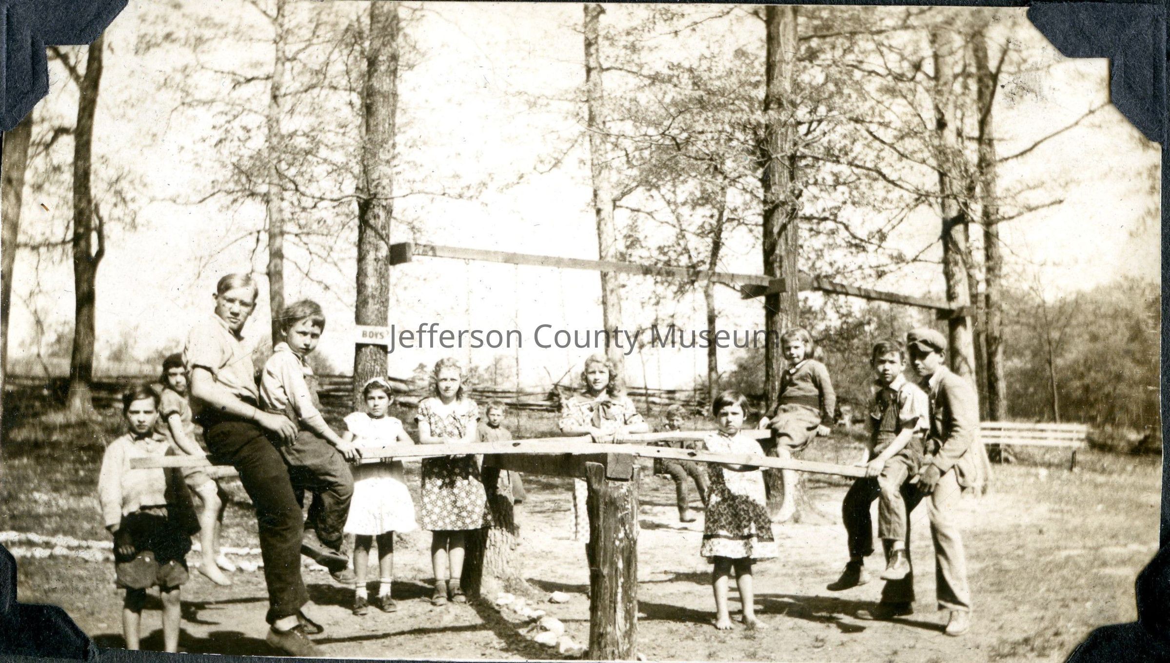 23. 12 people, mostly children, some on a seesaw (Daniel ? sitting on right of seesaw, center girl with bow Irma Gaynor)
