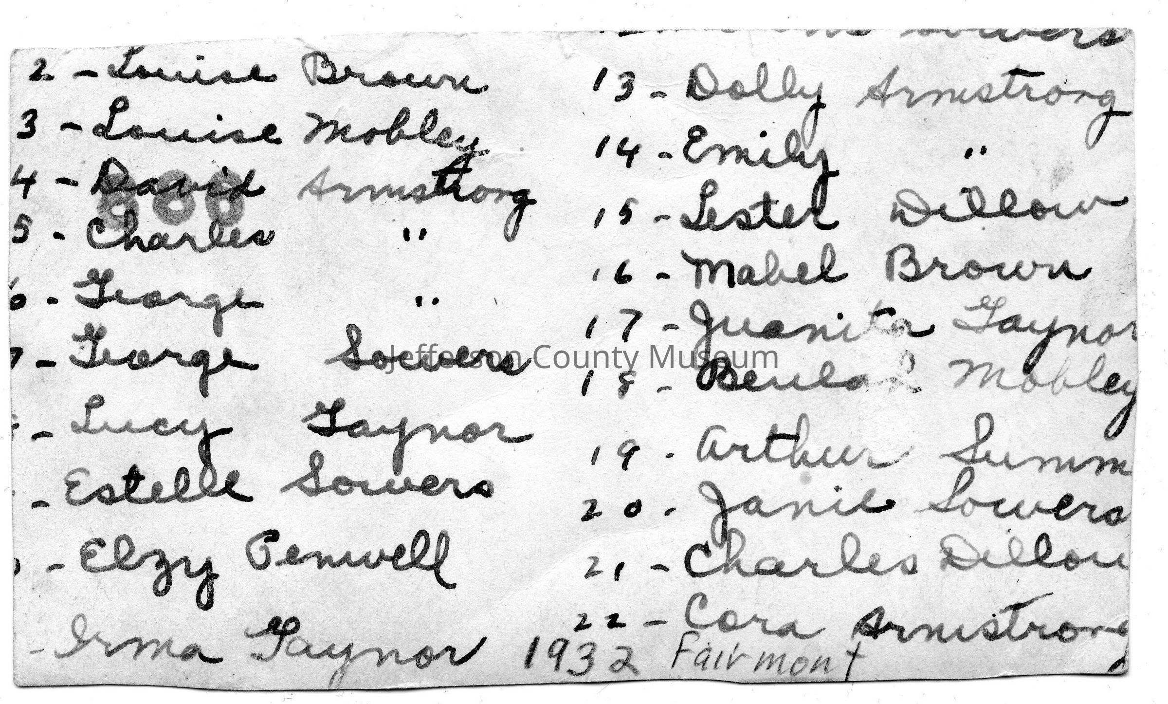 In addition to the 48 photos listed below, there are (a) 16 photos taken in Indianapolis, Indiana, in 1926, (b) five photos of Marianna Johnson (see IMG3922), (c) a photo from Charles Town Graded and High School (see IMG3923), and (d) 64 photos of local school children (Kabletown area) on pages 10-17. These 64 individual photos are restricted and not available to the public for 30 years beginning October 18, 2021, to protect the privacy of the subjects.