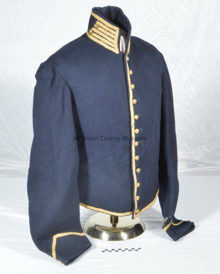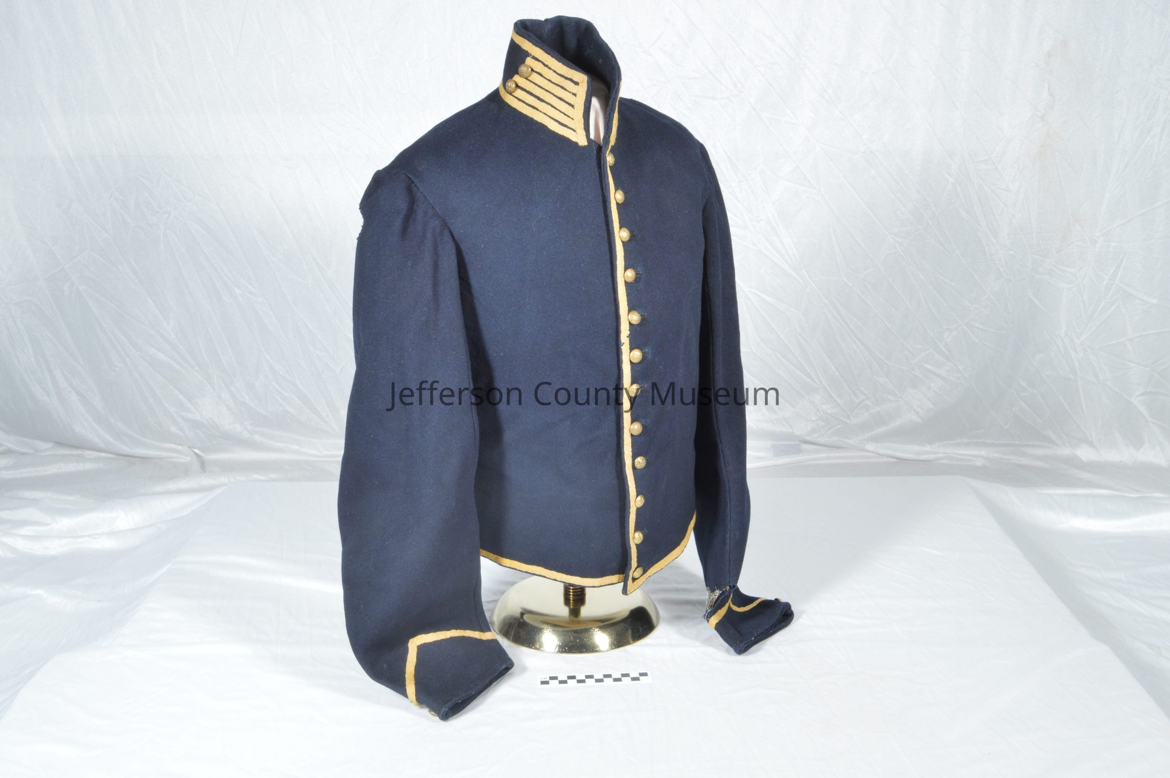 Dark blue wool U.S. cavalry Civil War shell jacket with yellow stripes on collar and one down front. Brass buttons with spread-winged eagle.Acquisition