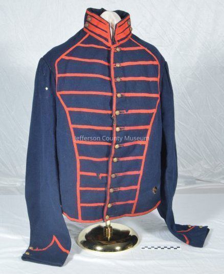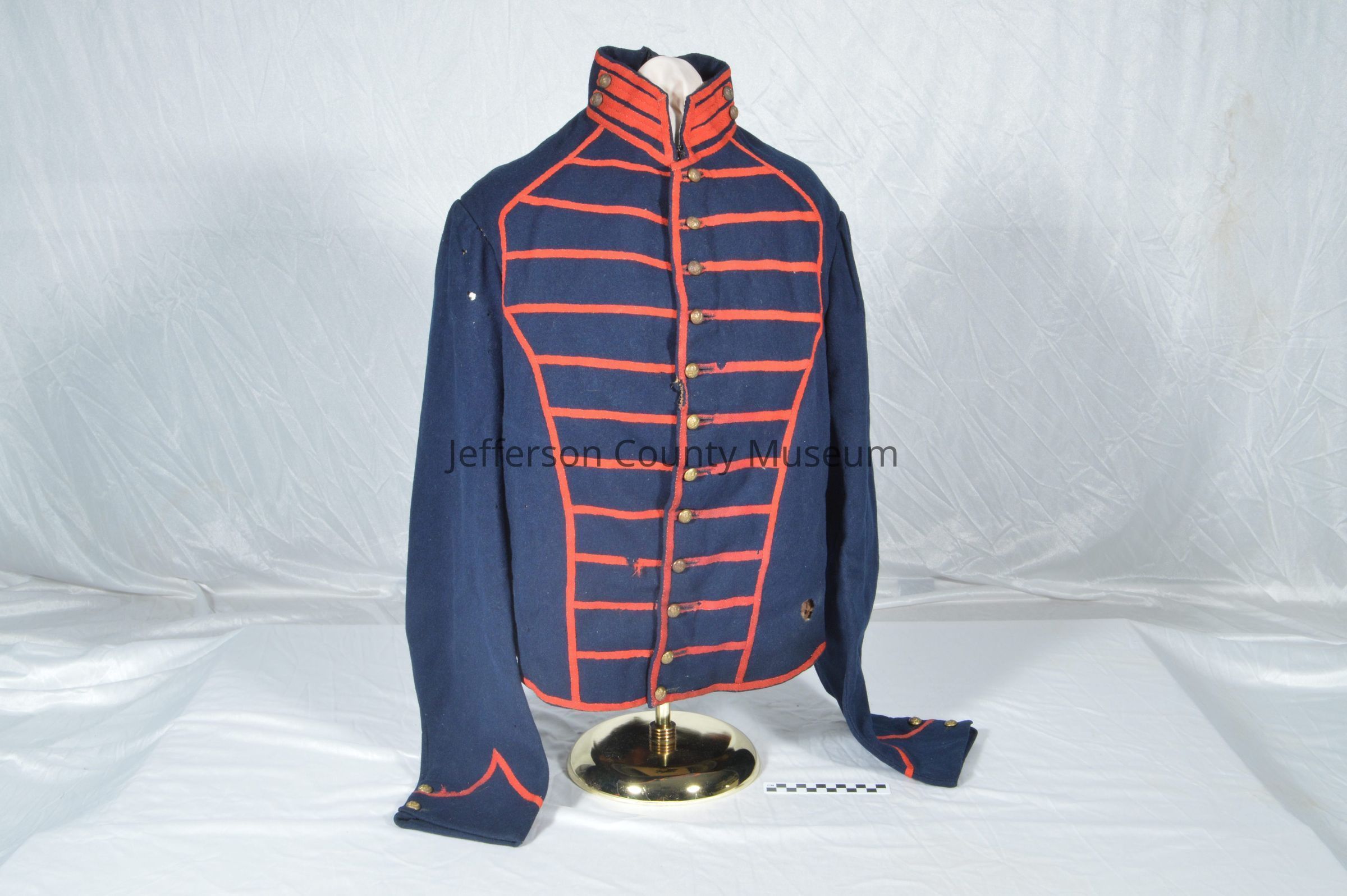 Dark blue wool U.S. Civil War musician's artillery shell jacket with red stripes on collar and horizontally down front. Brass buttons with spread-winged eagle.Acquisition