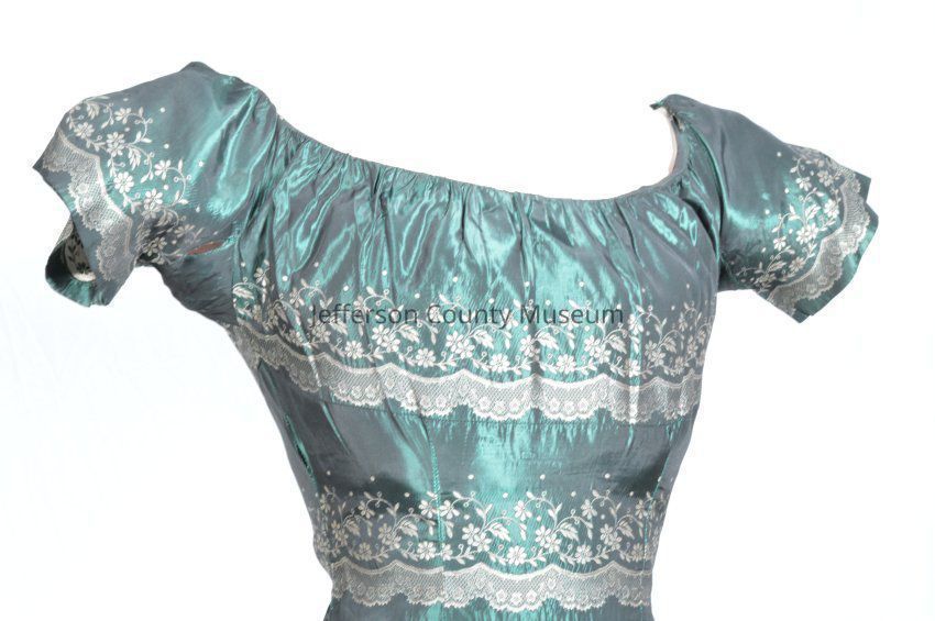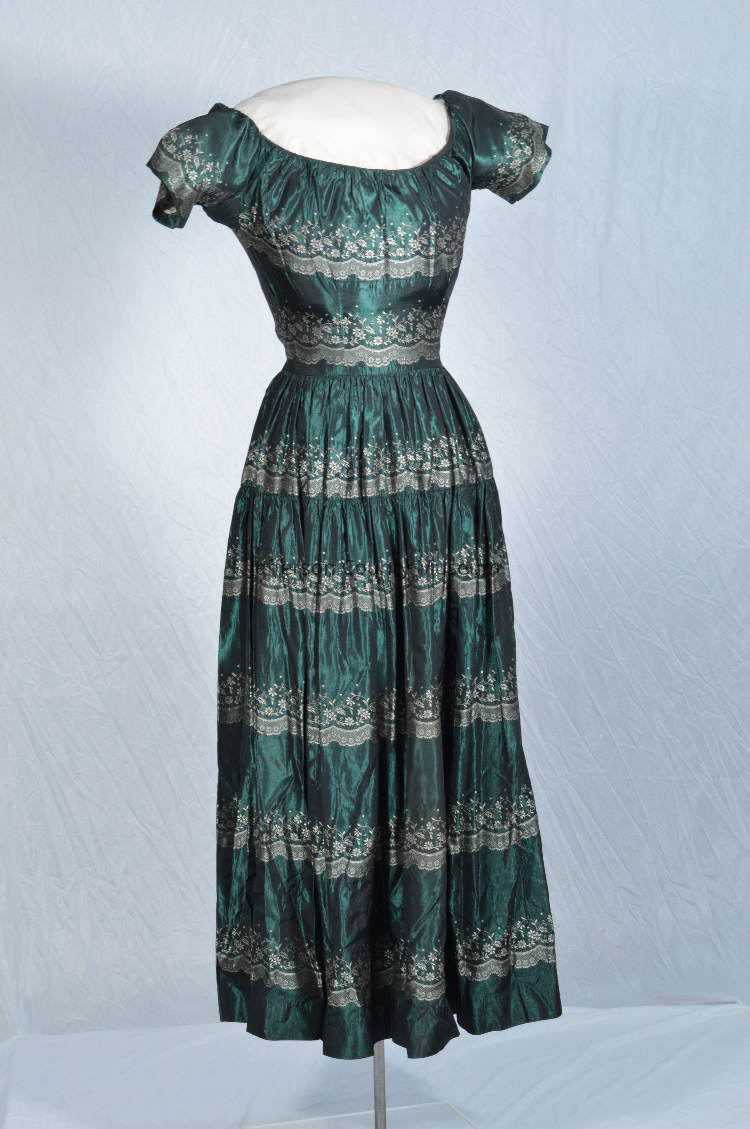 Evening dress belonging to Barbara Tanquary Shugart, circa 1950-1960. Dark green satin and silver brocade dress with fitted bodice and cap sleeves. The skirt has a top tier that is attached to the bodice and the remaining bottom of the skirt is gathered on the top tier, to give the effect of a full skirt.Acquisition