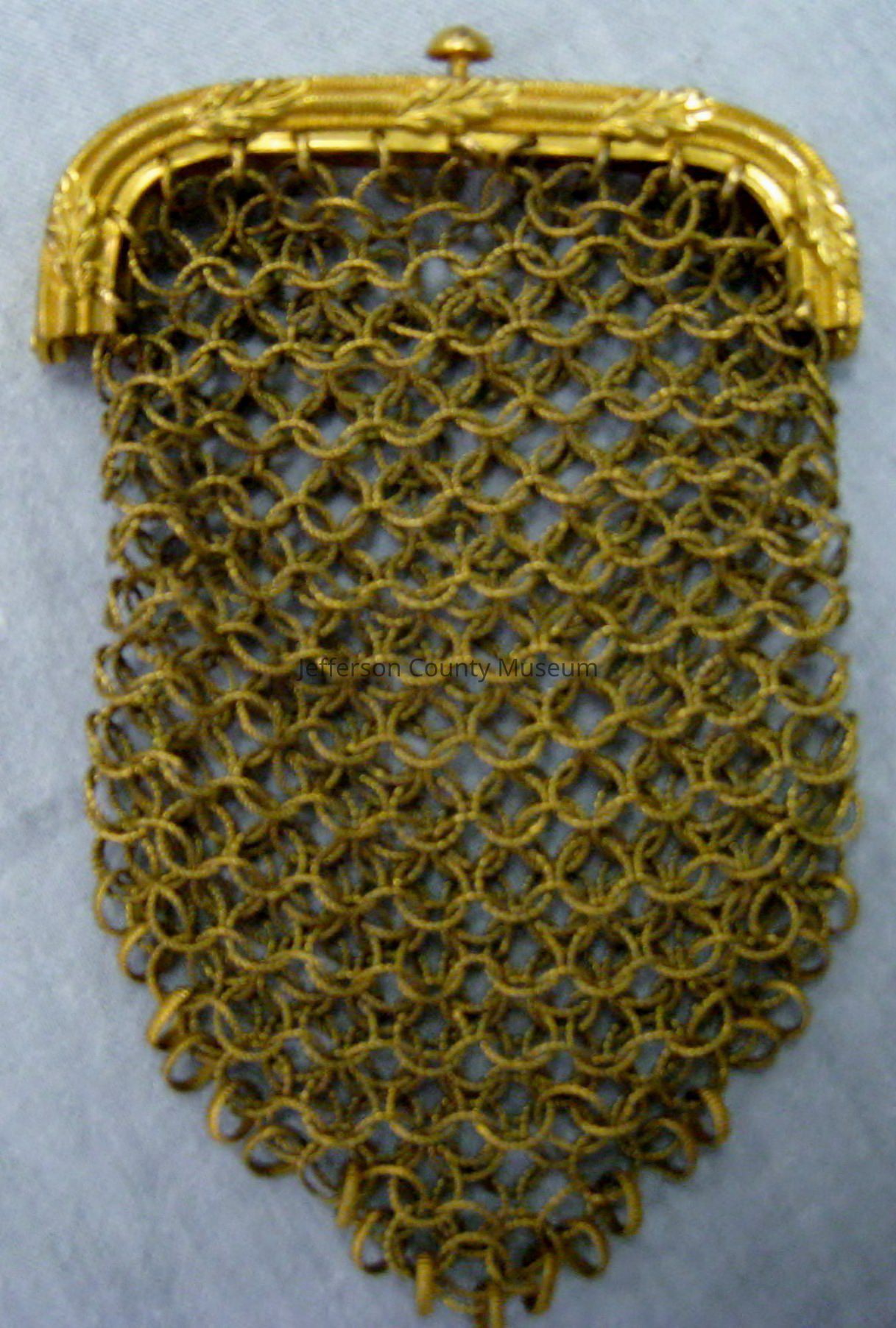 Gilt chain link purse. Small circular links make up purse. Heavy gilt clasp at top.