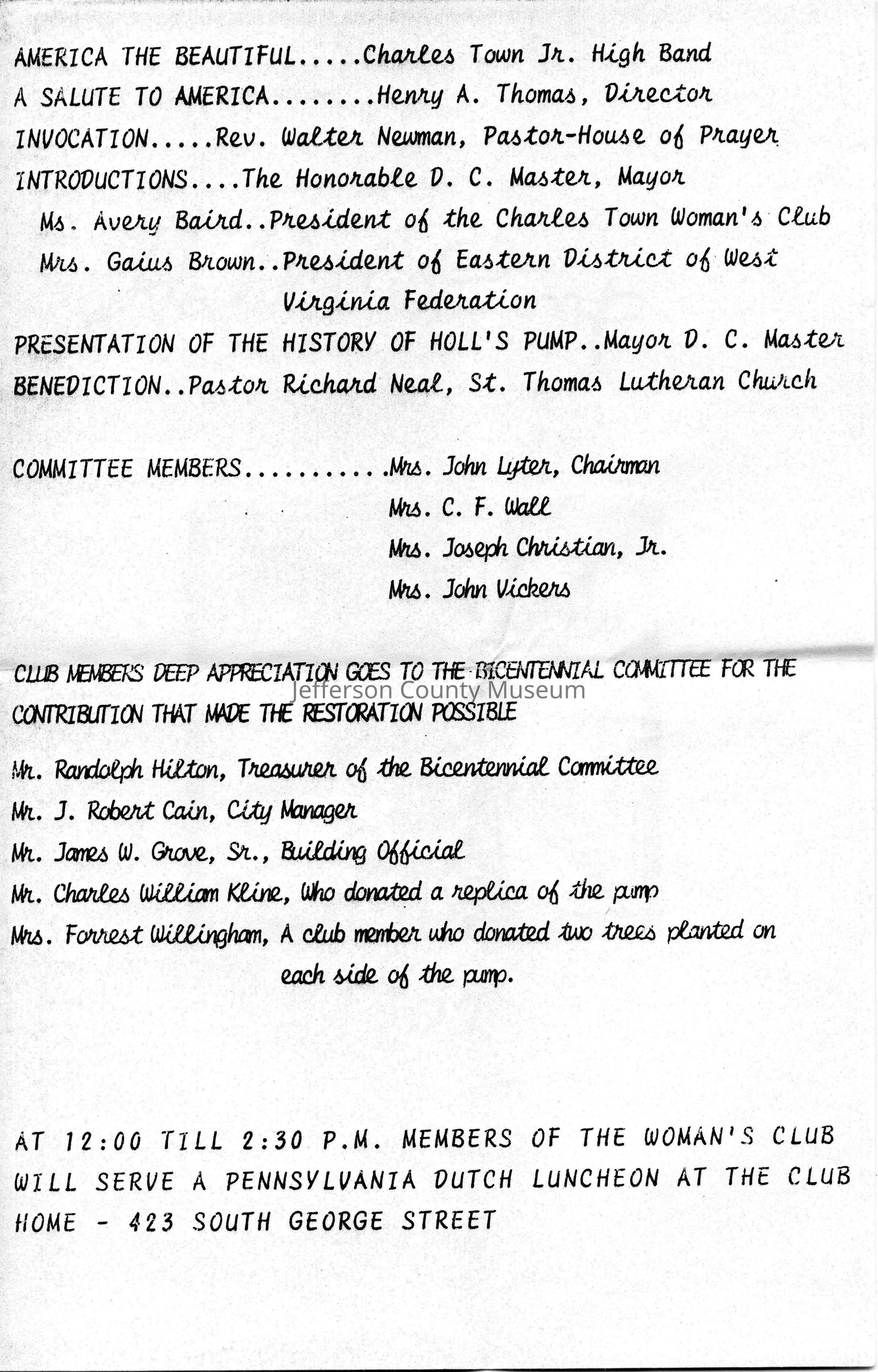 Holl's Pump Dedication Ceremony by Charles Town Women's Club [Program attached in Media]