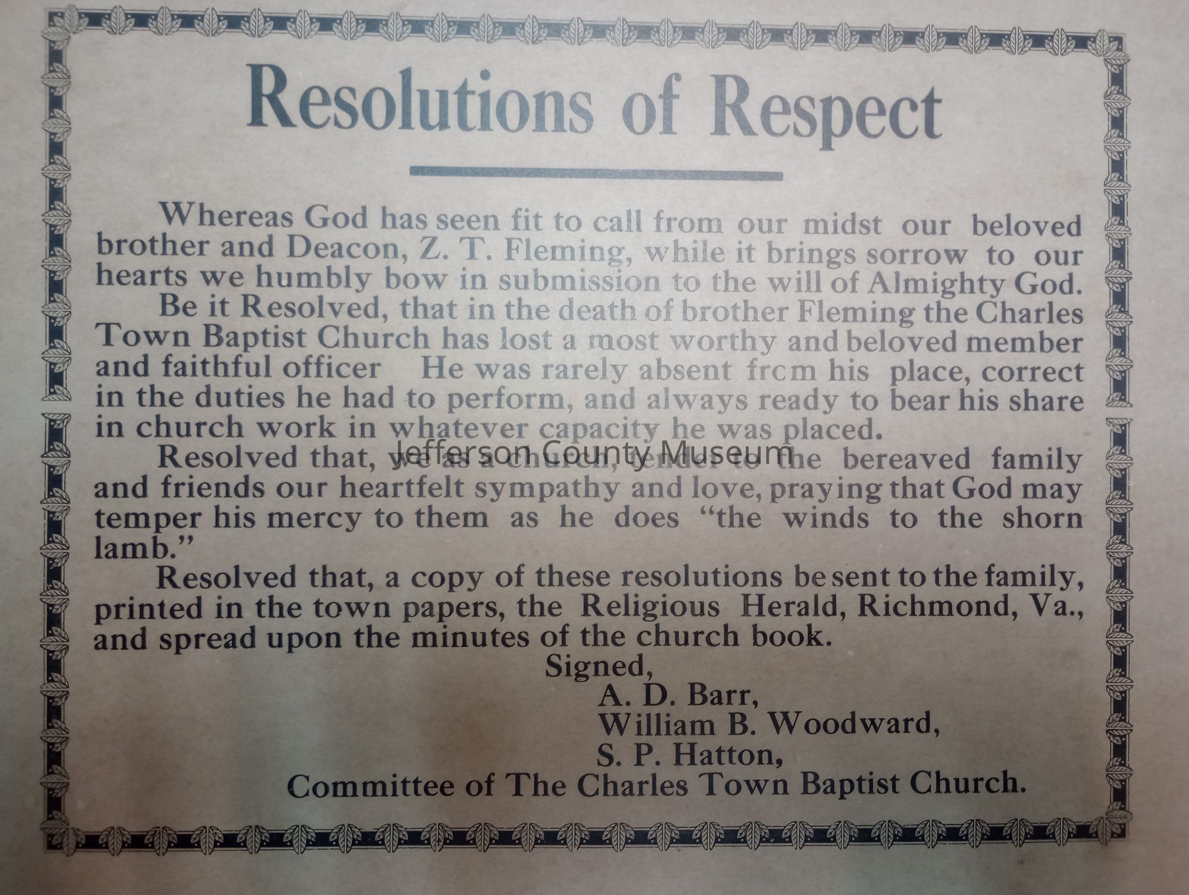 "Resolutions of Respect" printed on cardstock. Resolved by the Committee of the Charles Town Baptist Church, perertaining to ZT Fleming, who recently passed away and was a Deacon there. Describes Fleming's good character and diligence and resolves that copies of resolution shall be printed in local papers, sent to his family, and recorded in the Church Minutes.Acquisition