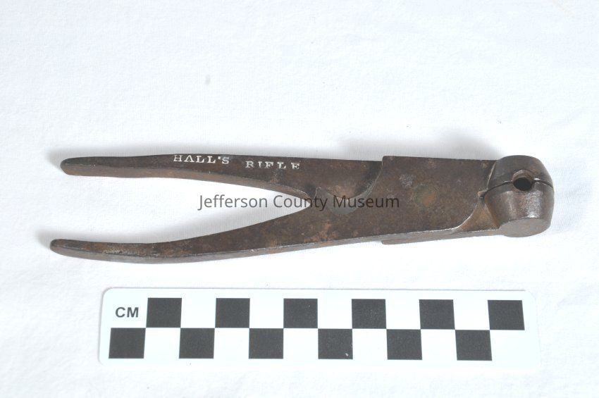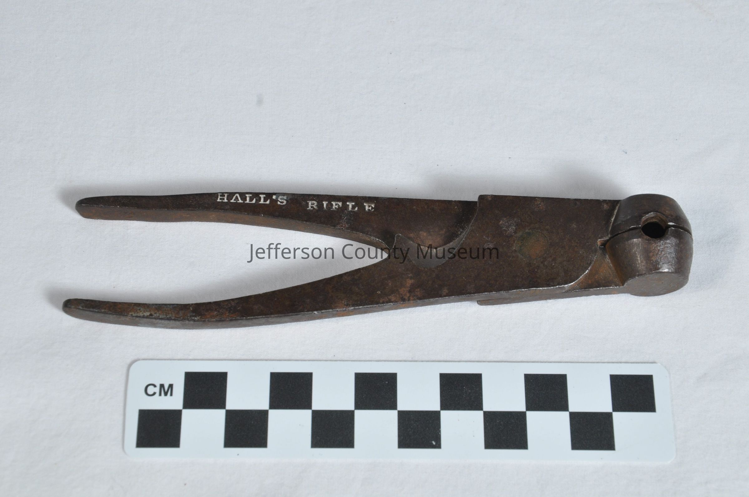 Iron bullet mold for Hall rifles. Mold is for one bullet. Made between 1824 and 1841. Designed by Hall for his Model 1819 breechloading rifle. (Man at Arms - NRA 1996).Acquisition