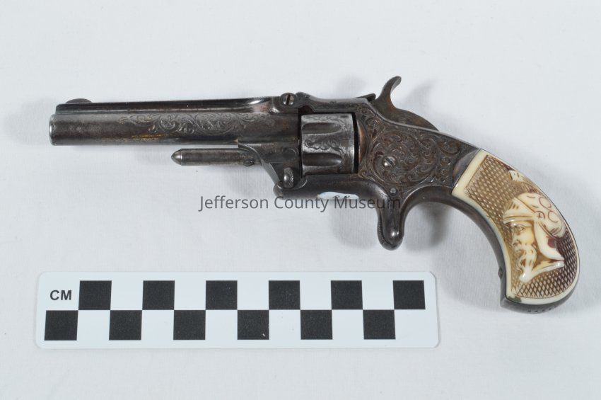 Smith and Wesson pocket pistol. Ivory handle with knight in helmet carved on grip. Elaborate engraving on barrel and frame.