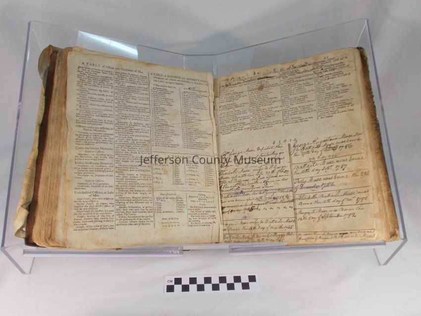 Leather bound Bible with parchment cover around the leather. Printed in 1789 by Mark and Charles Kerr, Edinburgh, Scotland. With handwritten information on the Battaile Muse family. Belonged to Battaile Muse.