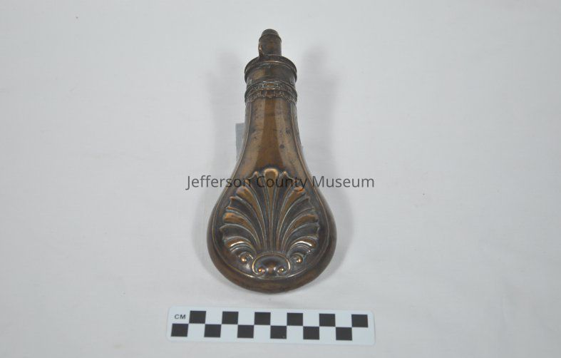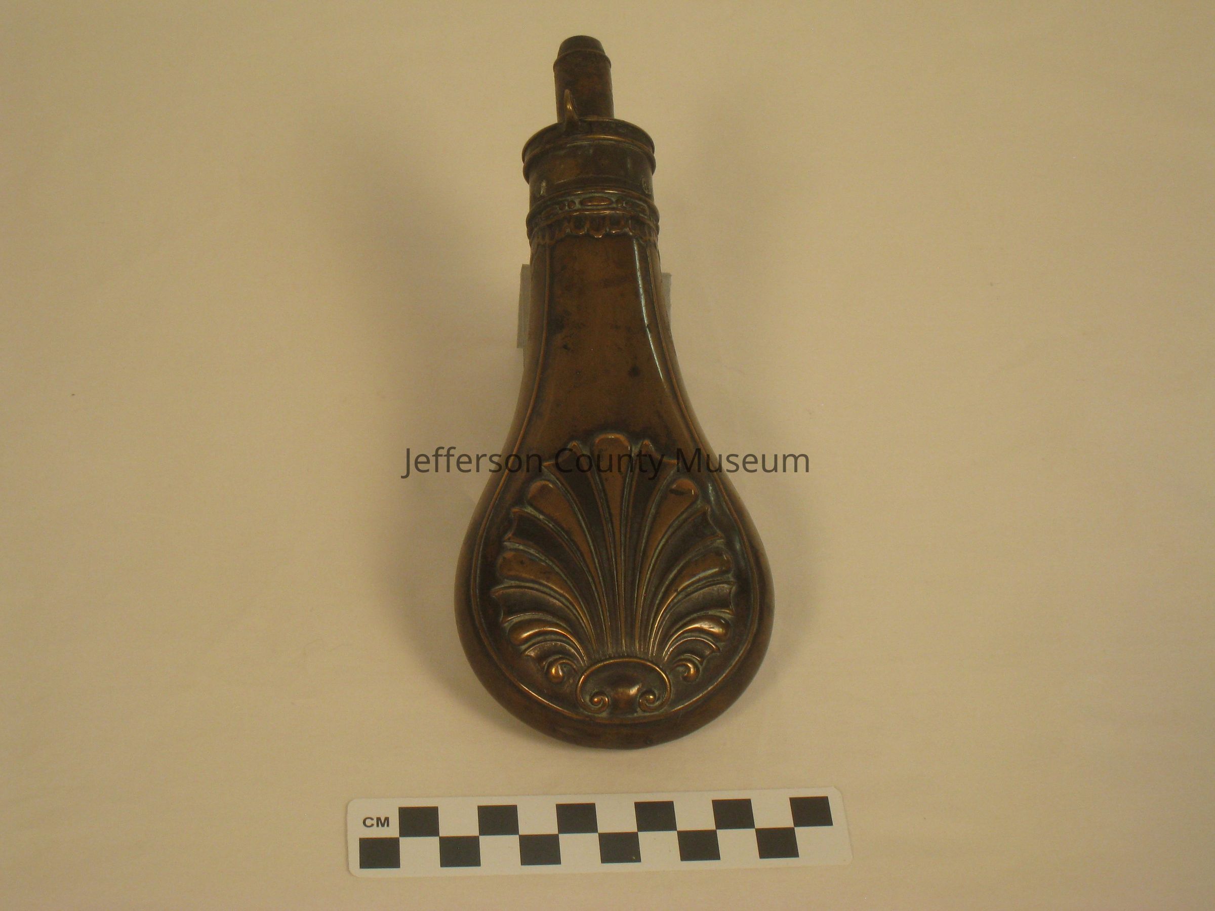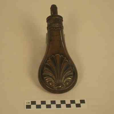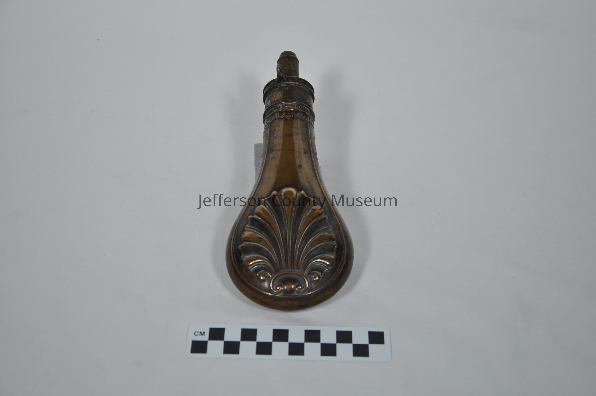 All brass flask. Measuring device on spout. Spout marked "G. 7 A.L.W. HAWKSLEY SHEFFIELD". Modified shell design in relief on both sides.Acquisition