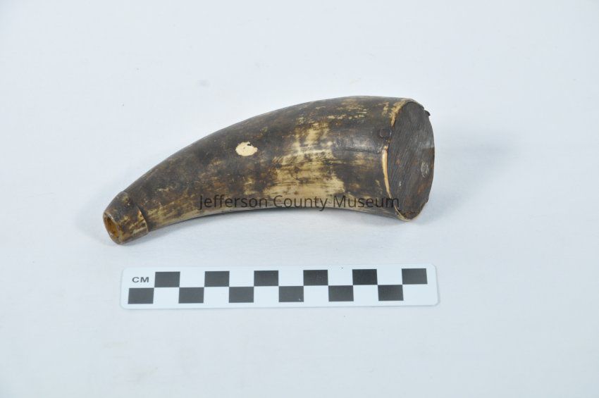 Powder Horn. Yellowed and stained. Stained almost completely black. Very badly deteriorated. Has wooden plug intact with 5 nails. There are cracks alongside the nails. (Paper Plug in end according to records) Paper plug is missing possibly inside the horn.Acquisition
