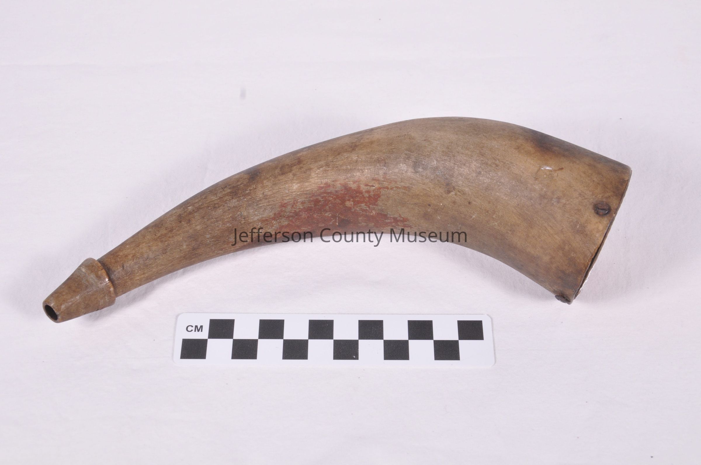 Powder horn. Circa 1830. The initials G. F. are on the body of the horn. There is a hole in the wooden tip. 4 nails intact. There is no cap. The example shows left hand use. There is a red stain on the mid section.Acquisition
