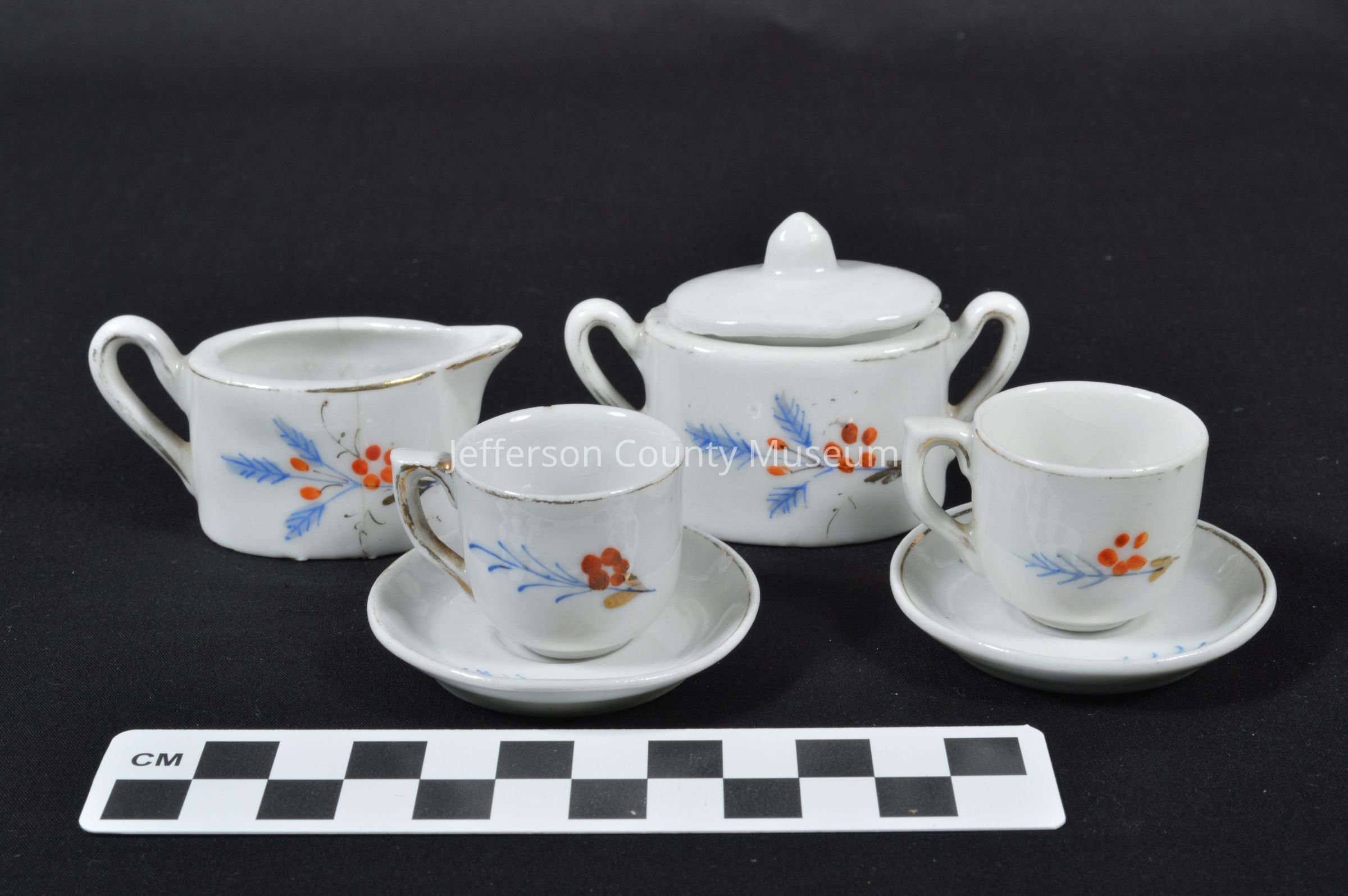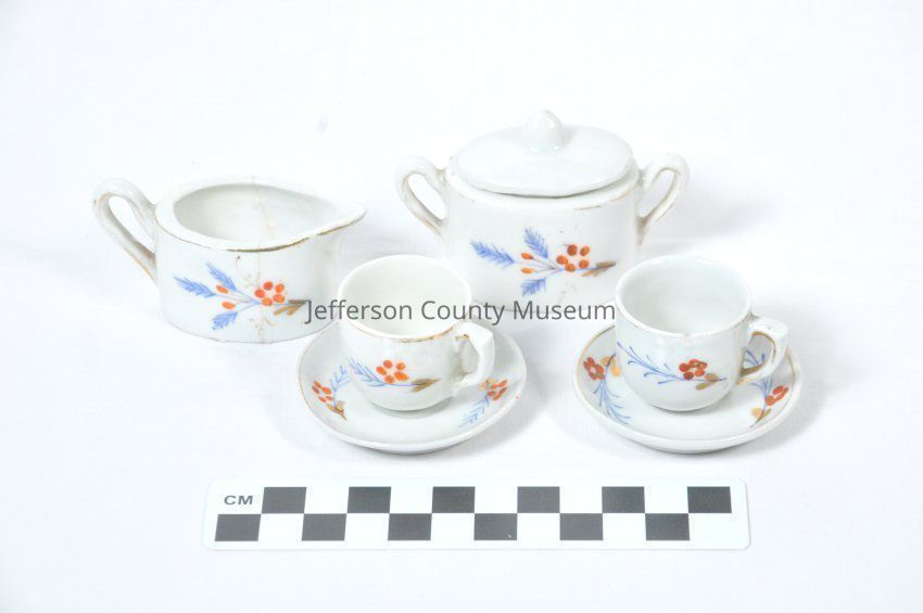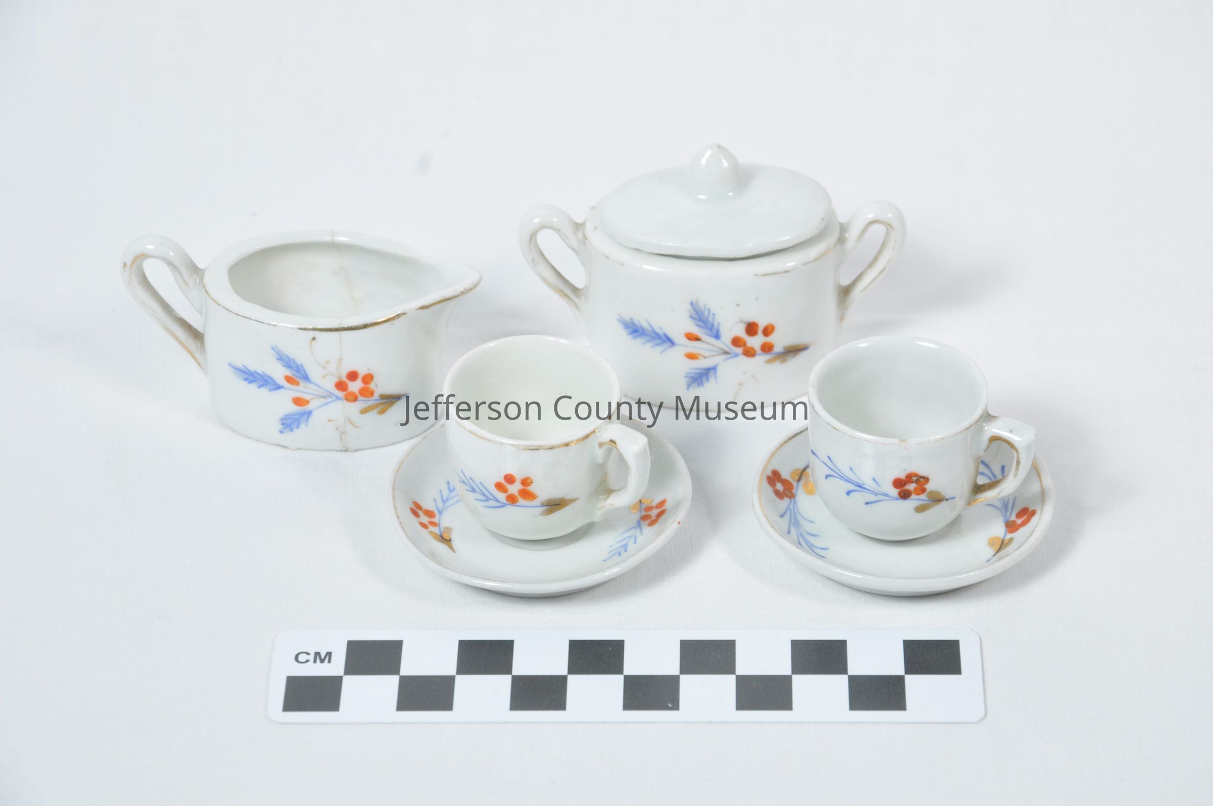 Tea set with 2 cups and saucers, one sugar bowl with lid, and one creamer. Blue, red and gold floral design. 911a: saucer, 911b, saucer, 911c: tea cup, 911d: tea cup, 911e: creamer bowl, 911f sugar bowl, 911g: sugar bowl lidAcquisition