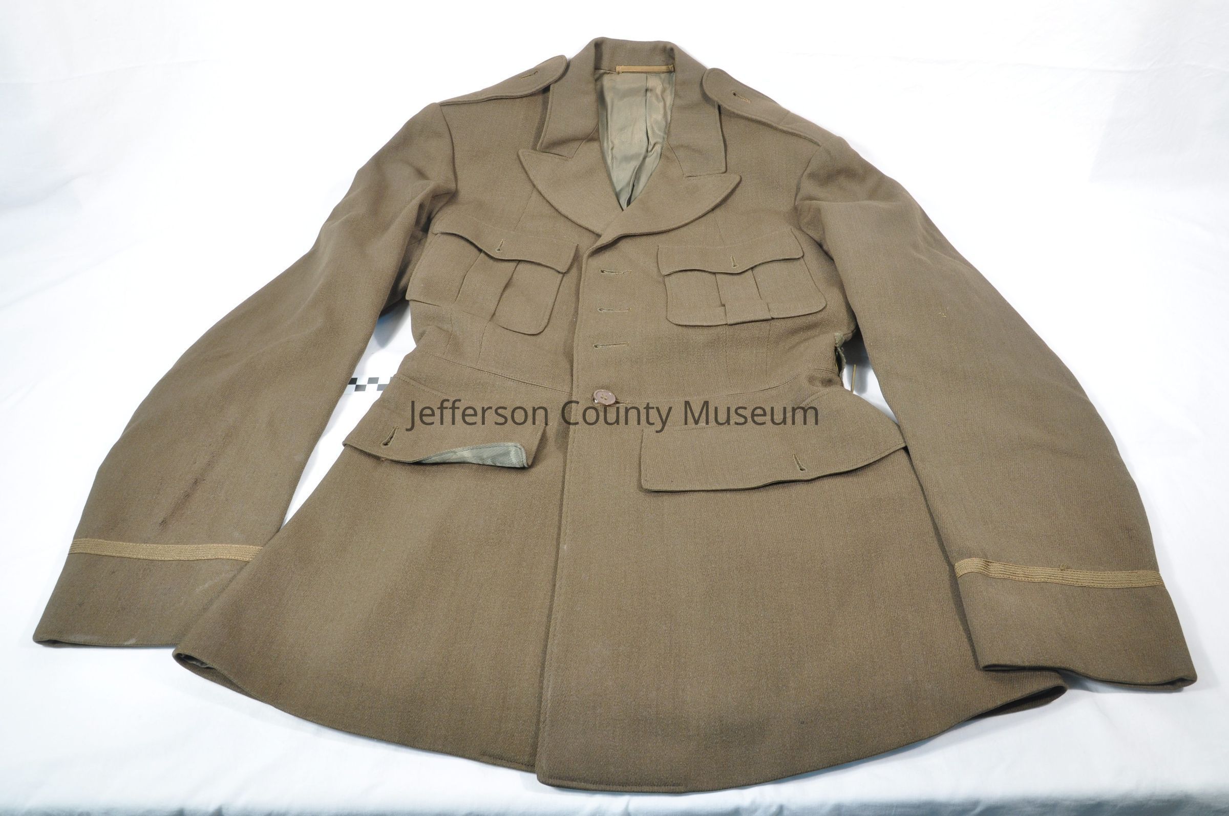 Dress OD (olive drab) brown World War II officer's blouse (coat). Stripe around end of each sleeve. Buttons have been removed. On a label on the inside of the left, inside breast pocket is "MADE EXPRESSLY FOR F. P. BANE 10/5/40". Black cloth label outside of the breast pocket "KAUFMANN'S fifth avenue pittsburgh". Brass belt hooks on back of the coat but no belt is with it.Acquisition