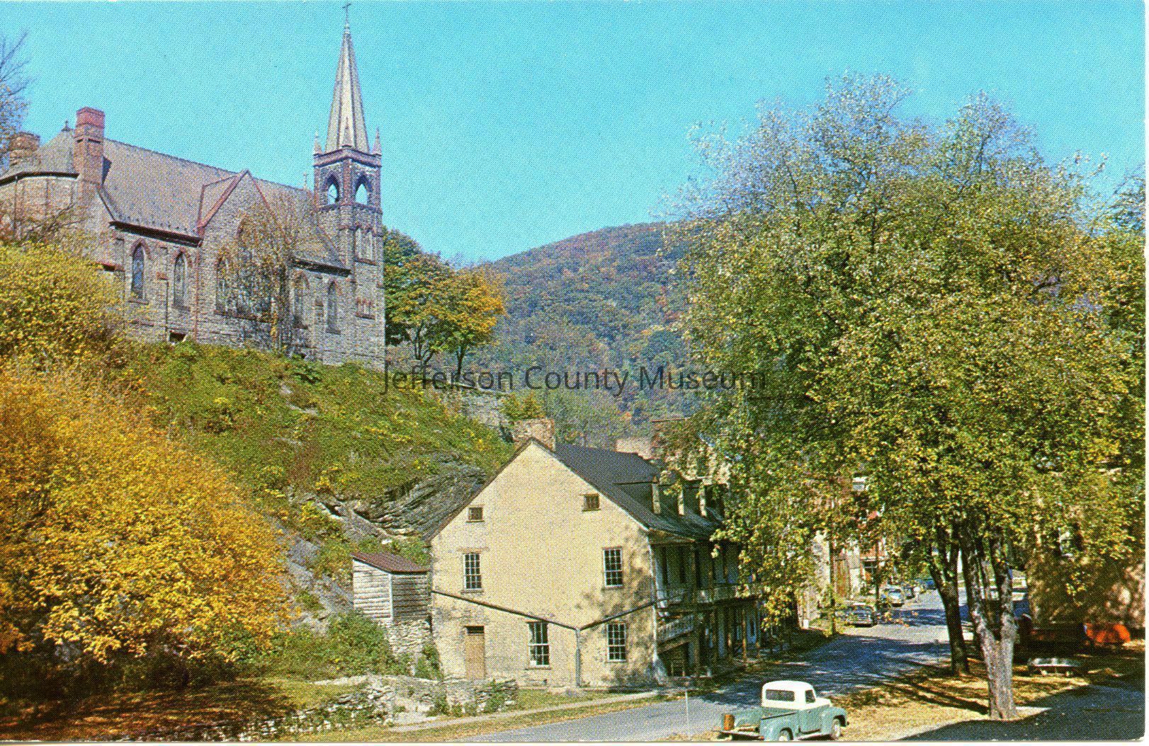 From this building stages used to ply between Harpers Ferry and Washington City, now Washington, D. C., a distance of approx. 58 miles. This is the original building constructed in 1859, prior to John Browns raid. At the top of the picture can be seen St. Peter's Catholic Church, which has not suspended services since 1830 to the present day.Acquisition
