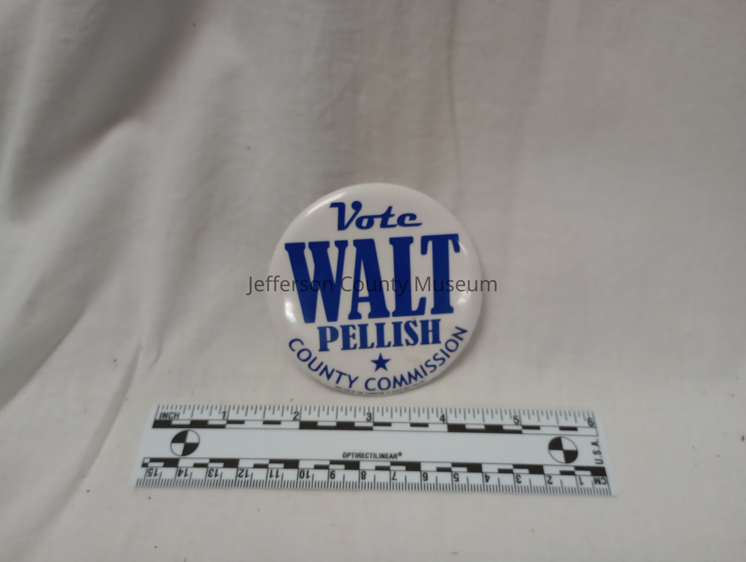 White political button with blue text "Vote Walt Pellish County Commission" with fine print text stating "Paid for by the committee to elect Walt Pellish"Context