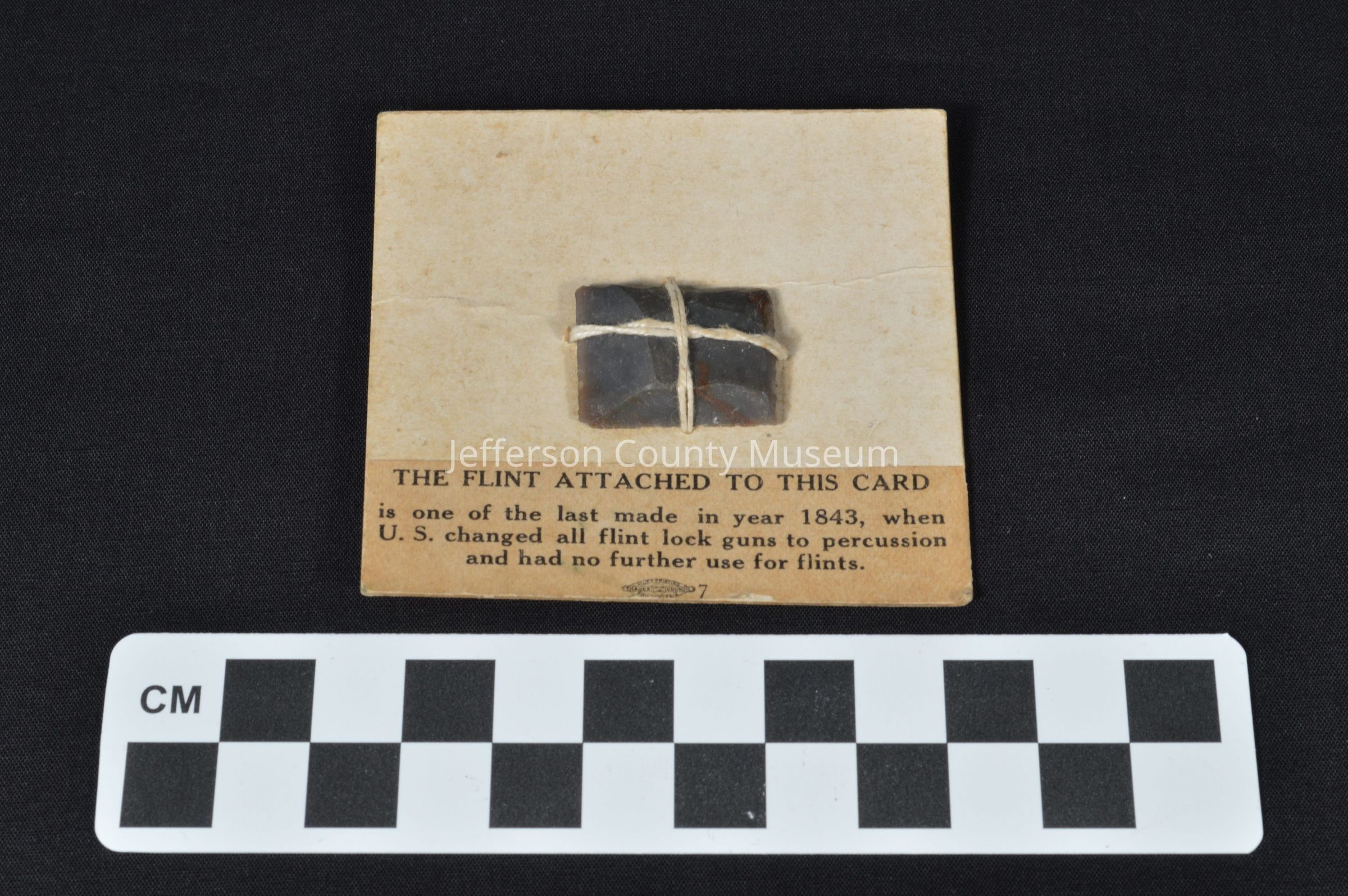 Musket flint mounted on a piece of cardboard. Flint is tied on with string. Note on card says " The Flint Attached To This Card is one of the last made in the year 1843, when U.S. changed all flint lock guns to percussion and had no further use for flints." Flint is dark brown.Acquisition