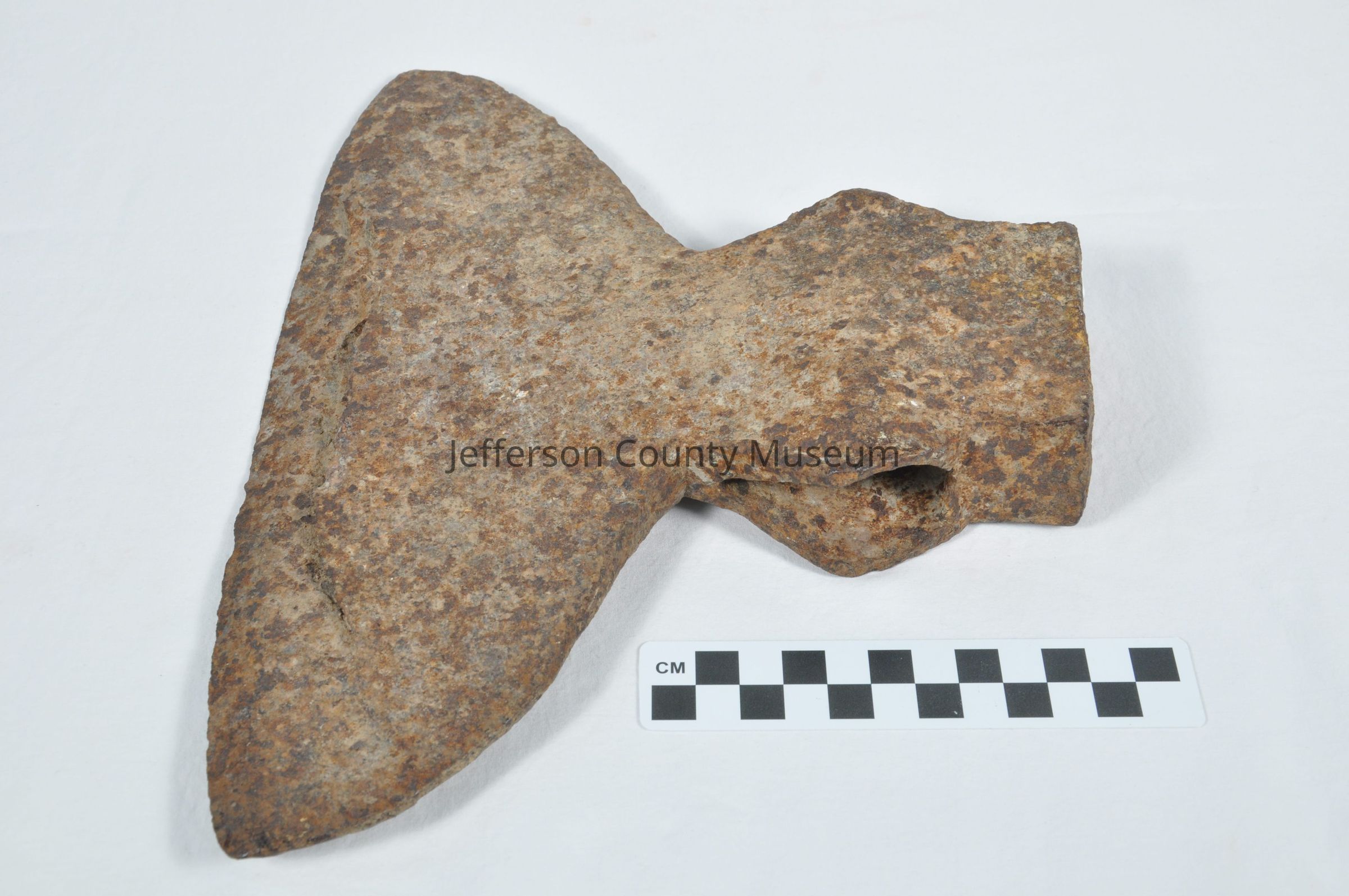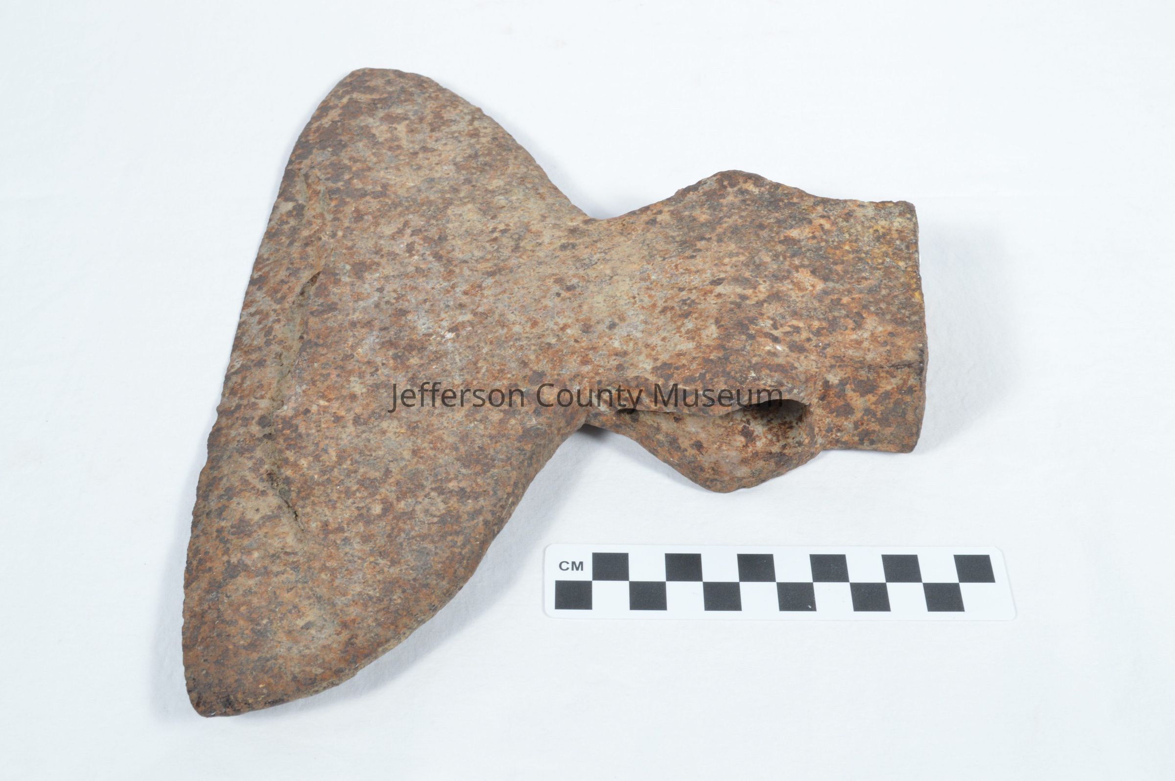 Broadax head. Late colonial period. About 1 1/2 inches from cutting edge is split but the metal is attached at upper and lower edges.Acquisition