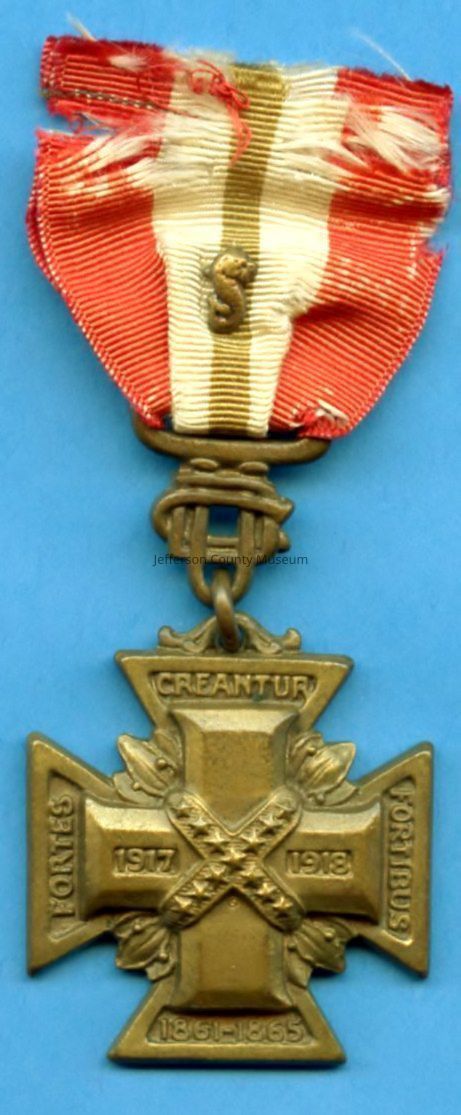 Bronze United Confederate Veterans medal in shape of Maltese Cross. Dated 1917-1918. Red, white and beige ribbon. On top arm of cross CREANTUR. Left arm FORTES, Right arm FORTIBUS, bottom 1861-1865.Acquisition