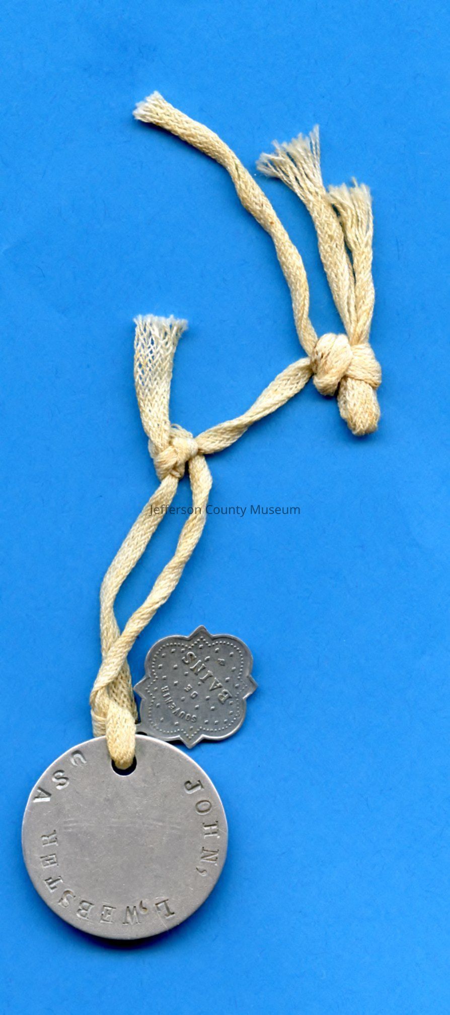 Round aluminum identification tag from World War I. Stamped on front JOHN, L, WEBSTER USA Stamped on back 1833385 Religious souvenir medal attached.Acquisition