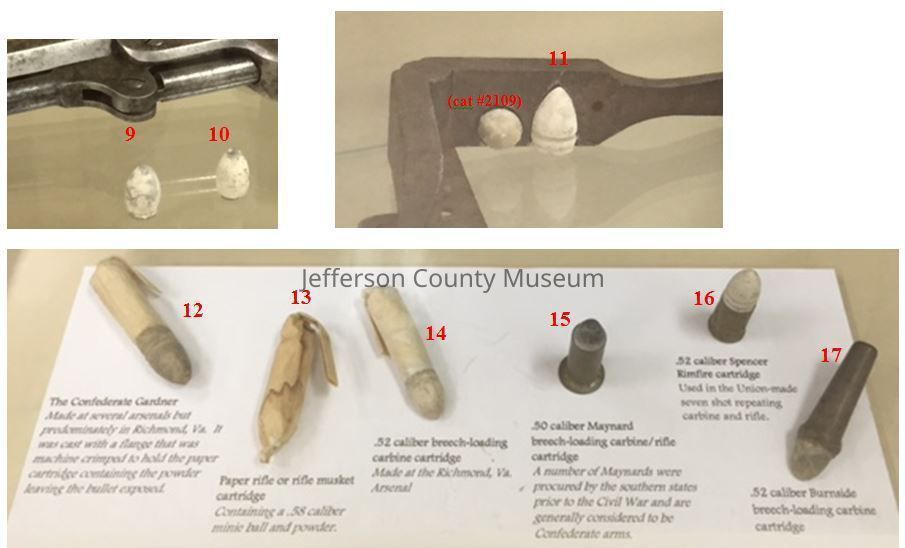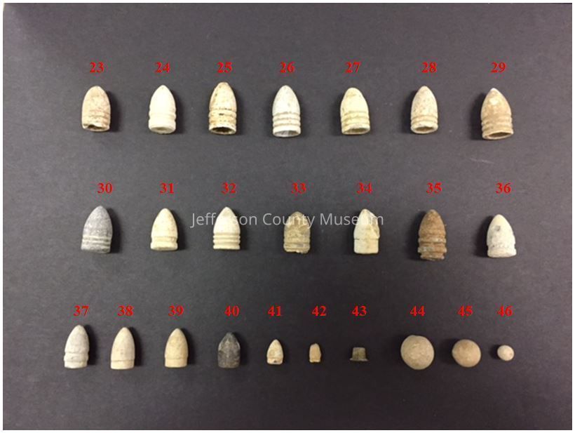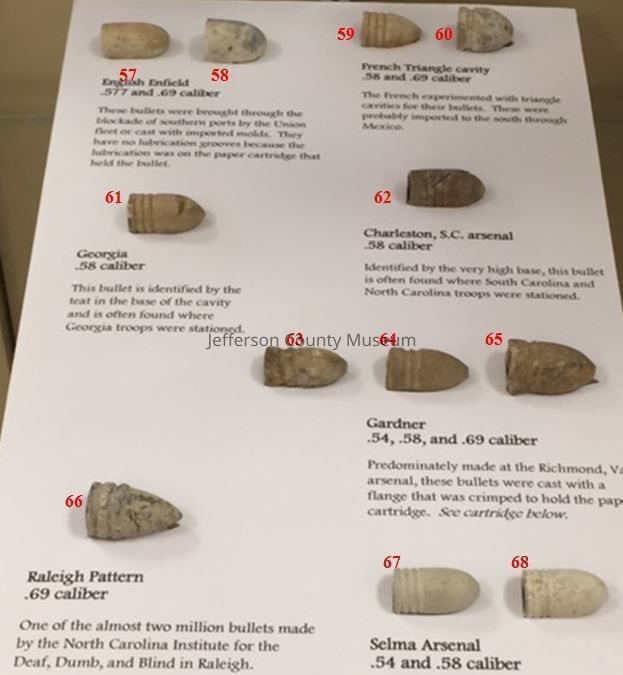 Includes: 1 percussion cap, 1 .28 Colt Root, 1 .31 Colt, 1 .435 Tranter, 1 .36 Savage, 1 .44 Colt Army, 1 .58 round ball, 1 .69 round ball, 1 small buckshot, 1 .55 Suhl Carbine, 1 Colt Revolving Rifle, 1 pulled bullet, 1 Gallager breechloading, 1 Sharps tie ring, 1 .54, Following are Confederate: 1 Morse, 1 .54 for rifle, 1 country hunting rifle, 1 double rifle or shotgun, 1 Selma, AL Arsenal Colt Revolving Rifle, 1 11 mm pinfire, 1 .44 Henry, 1 pounded flat minie ball and 1 unknown.Acquisition