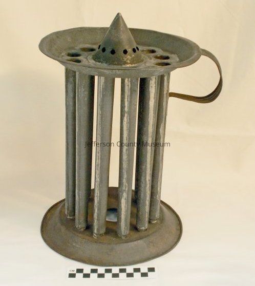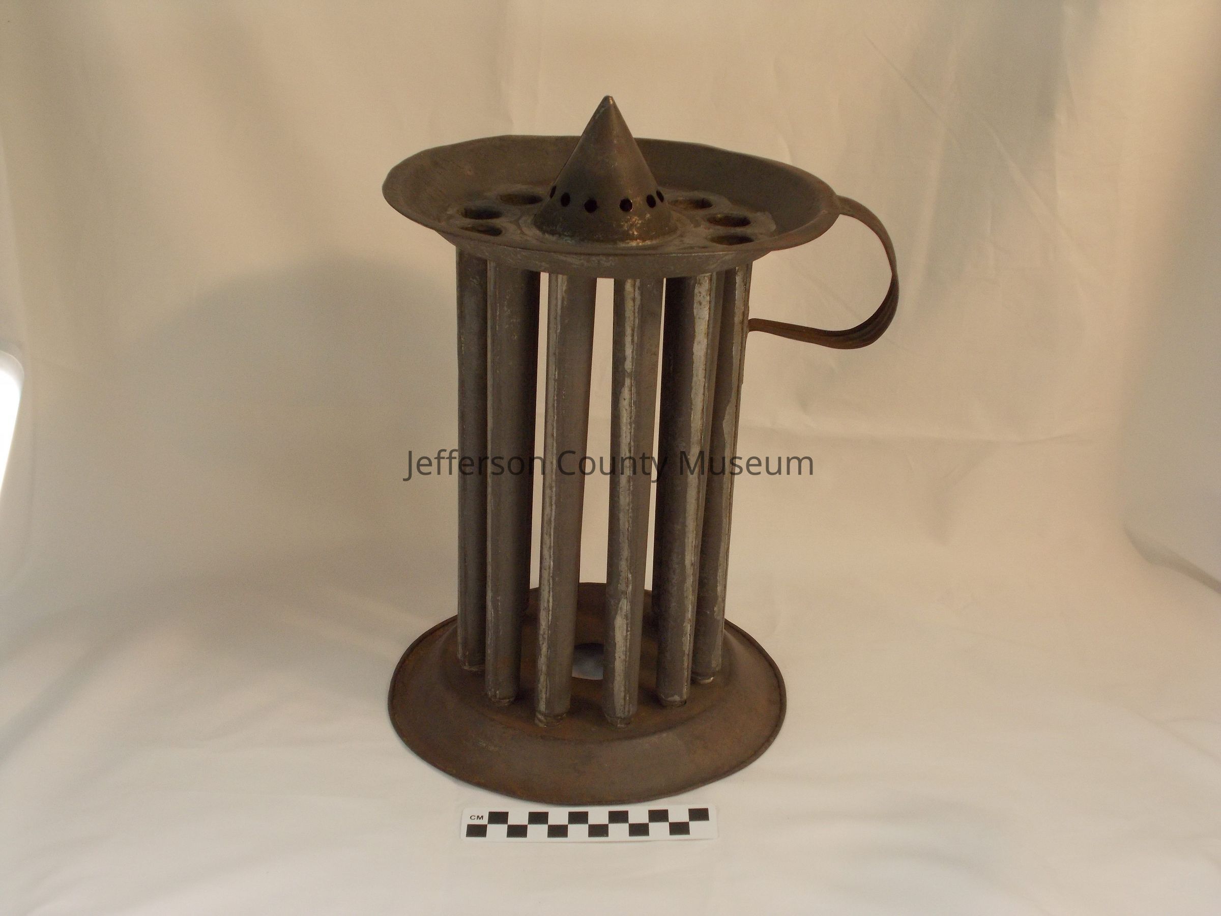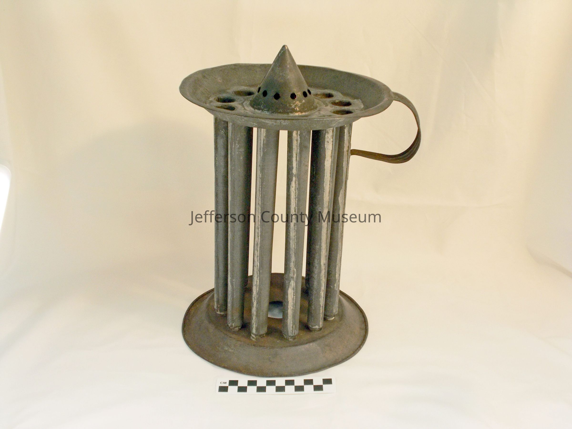 Round tin candle mold with 12 holes. There is a handle at the top near the mold holes. There is a cone in the middle of the top with 12 small holes around the base. Round plates at the top and bottom are bent.Acquisition