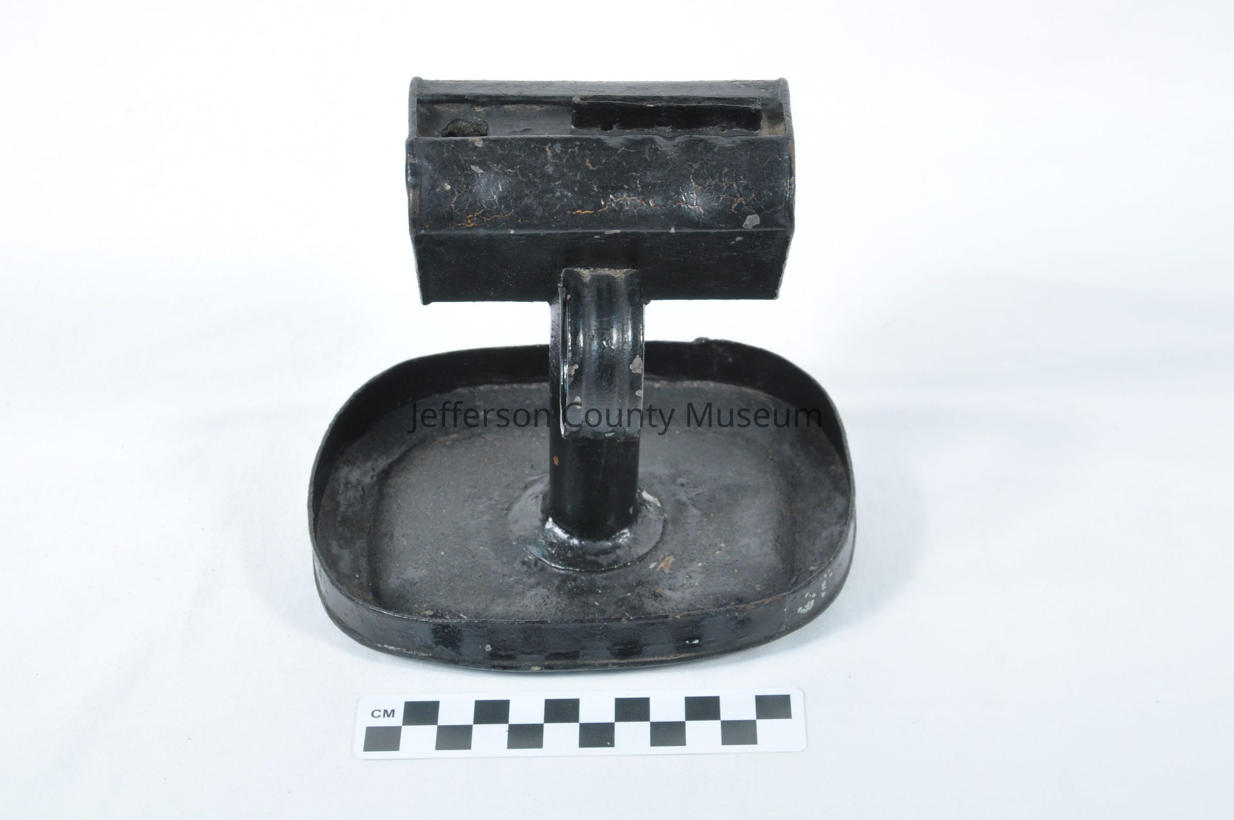 Tin torch-type lighting device. Over-painted in black. No wicks. Saucer base. Circular hook. Triangular top. There are cracks along the paint. It is rusted and has dents.Acquisition