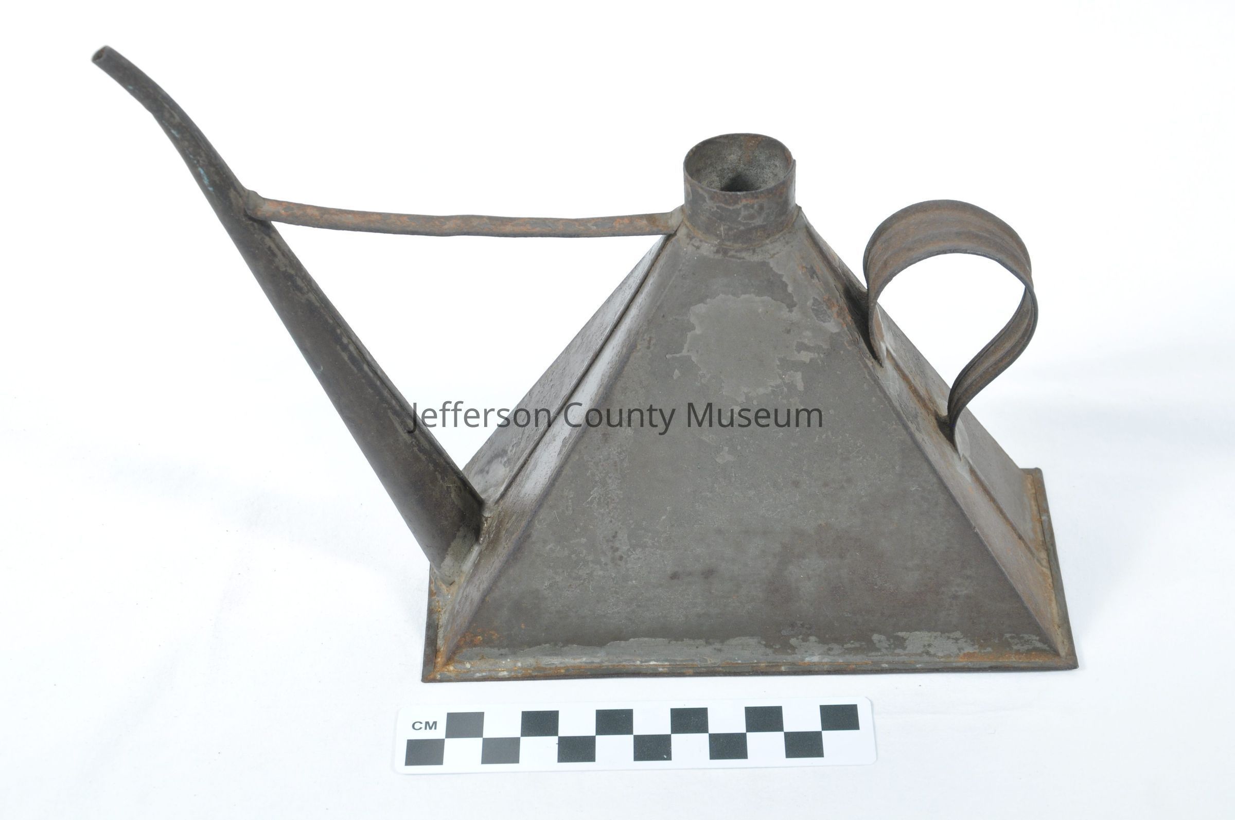 Tin oil can. Triangular shape with long braced spout. Piece of tin connecting the can and spout. Small circular top and rectangular bottom. Tin hook. It is rusted.Acquisition