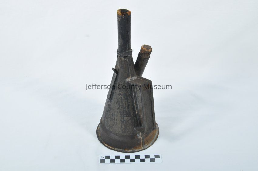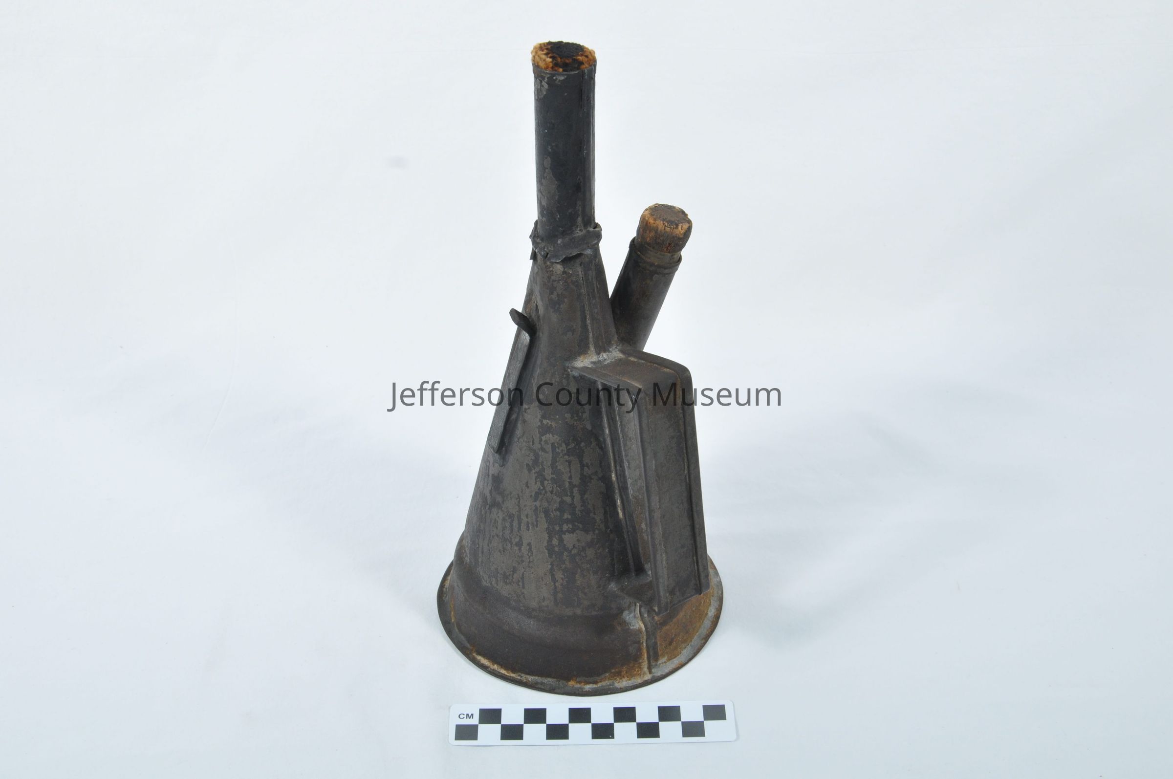 Torch-type mine lamp or parade lamp with fill spout next to wick. There is wick in the spout and a cork in the fill spout. Cone shaped. It is dented and heavily rusted. Also there are chipped pieces missing around the base. Circa 1900.Acquisition