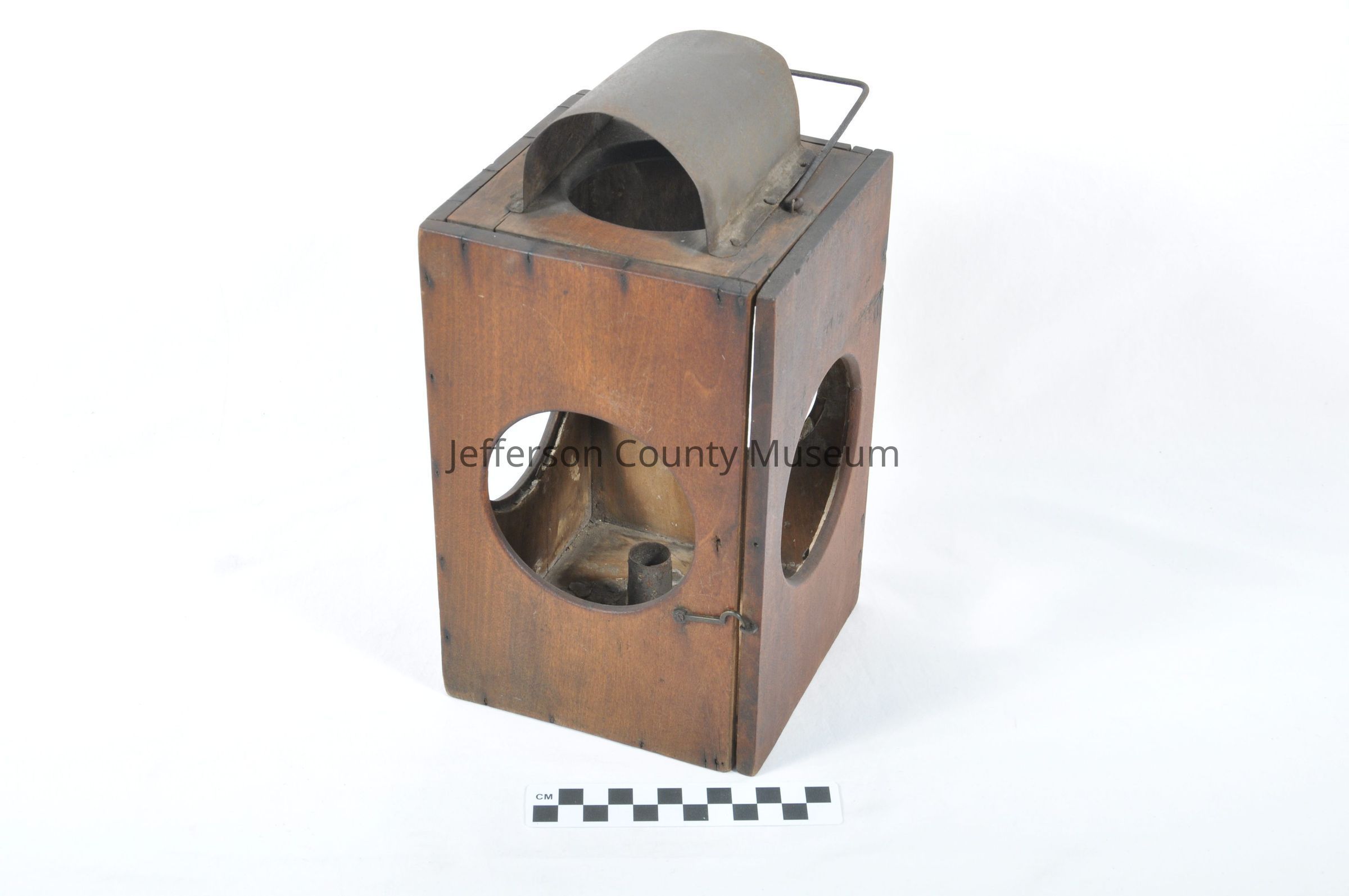 Wood and tin candle lantern with glass panels missing. The panels are a circular shape and there are 4 of them. Square wire hook. Arched tin shield on top with 3 nails on each side making a total of six. No wick. Door closes with hook. Slightly rusted. Circa 1850-75.Acquisition