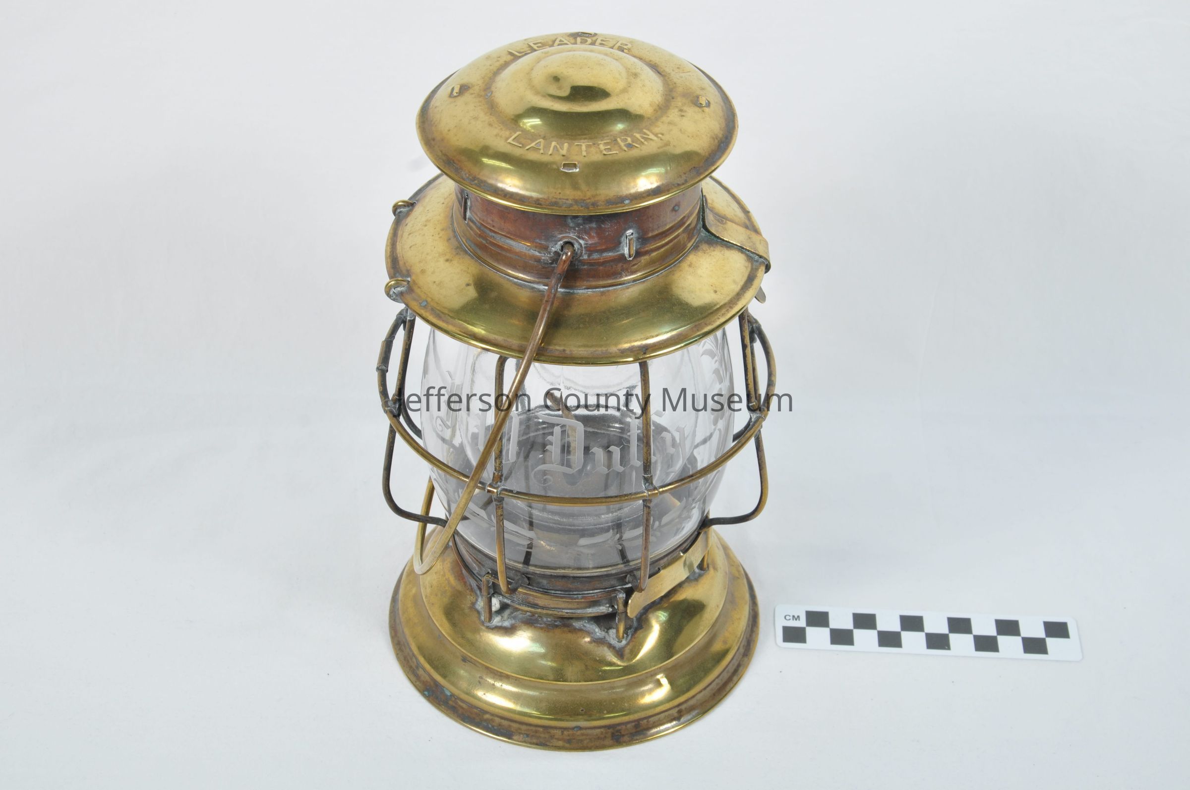 Brass railroad lantern with engraved globe. Brass hook. Circular piece of globe sticks out. On the turn dial there is a star and circular print. Has wick. Printed on inside glass lanterns "Rayo; No. 00 Hot Blast; Made in the U.S.A." Printed on globe "J. M. Duffy." On top Printed "LEADER LANTERN." Printed on hinge "PATENTED Oct __ ND 1878" The numbers could possibly be 02(?). There are black markings on the bottom. There is slight discoloration and minor dents.Acquisition