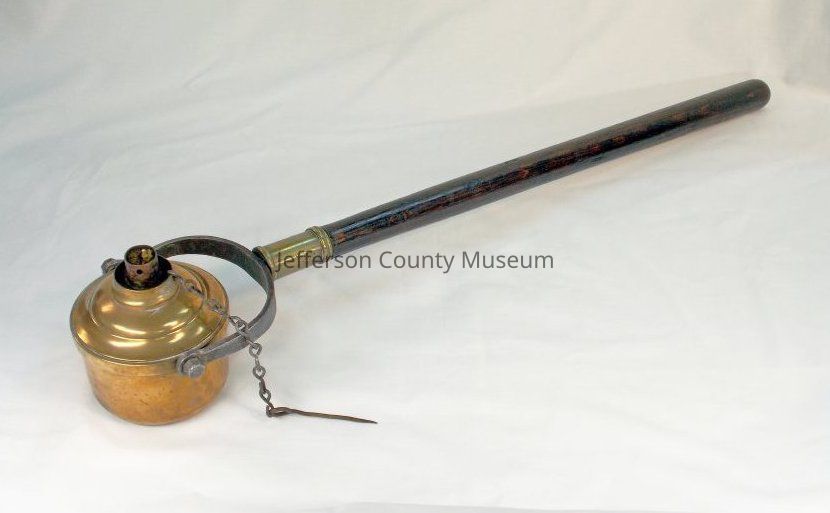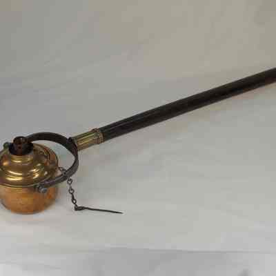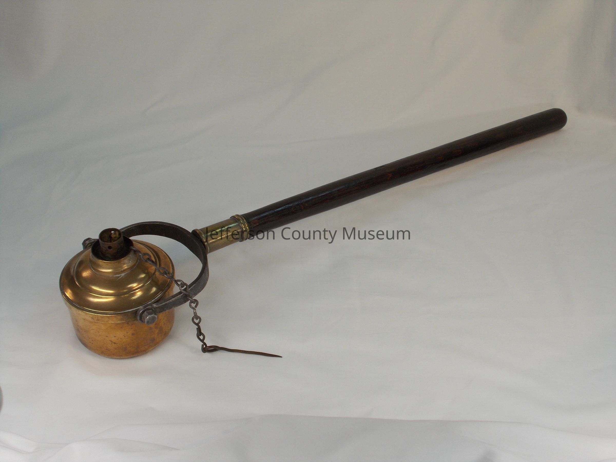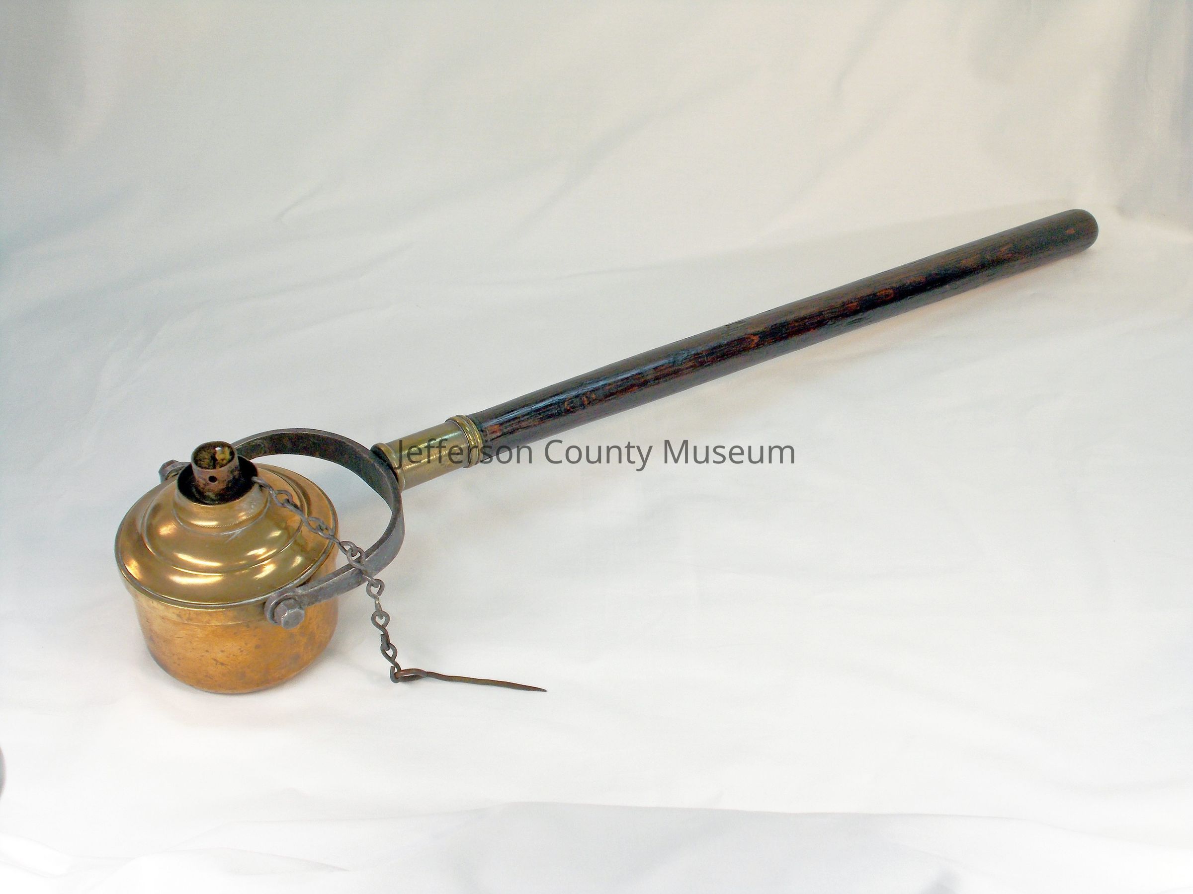 Brass Parade torch with wooden handle. Circa 1860-70. Metal chain on top of torch attached to pin to hold wick in place. Horseshow shaped iron holder for oil pot. Original wick. Slight tarnishing on brass.Acquisition