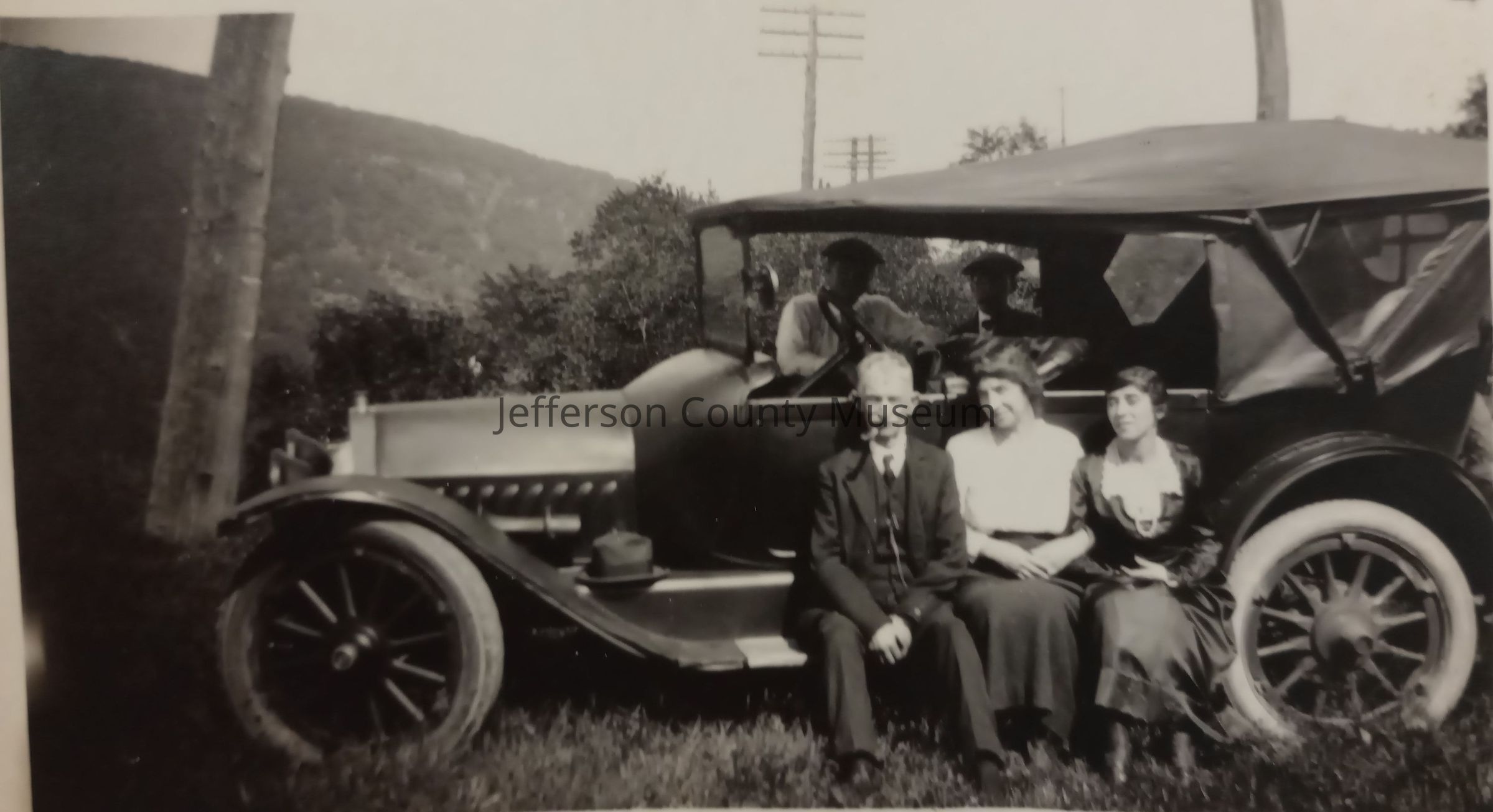 Black and white photo of five people posing in front of and behind a car. One man and two women sit in front with the man's hat to the left of them, and to younger men stand on the other side of the car and are visible through the window. The Blue Ridge mountains near the gap is visible in the background, as are telephone poles.Acquisition