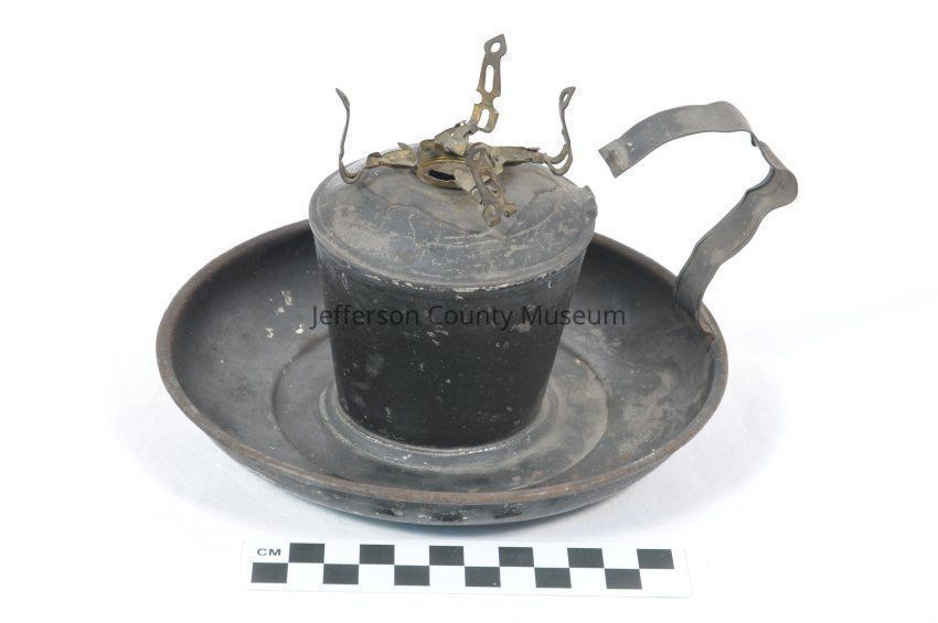 Tin oil lamp with chimney missing and handle separated from oil reservoir. Marked " STILLMAN SAFETY LAMP; PAT. AUG 1902; JOHN A. HURLEY, INC.; BRIDGEPORT , CONN."Acquisition