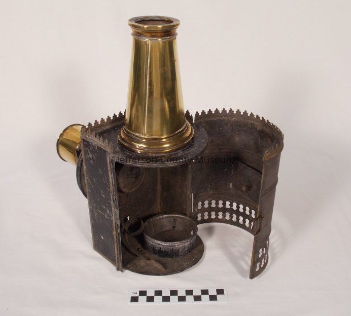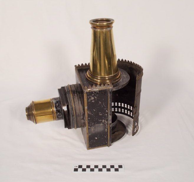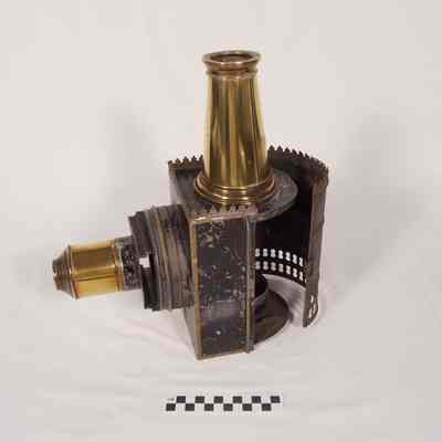 Brass and tin magic lantern (glass slide projector). Circa 1870. Lens inside lamp for projecting images and at end of tube protruding from body of projector. Brass chimney not attached. No reservoir for oil.Acquisition