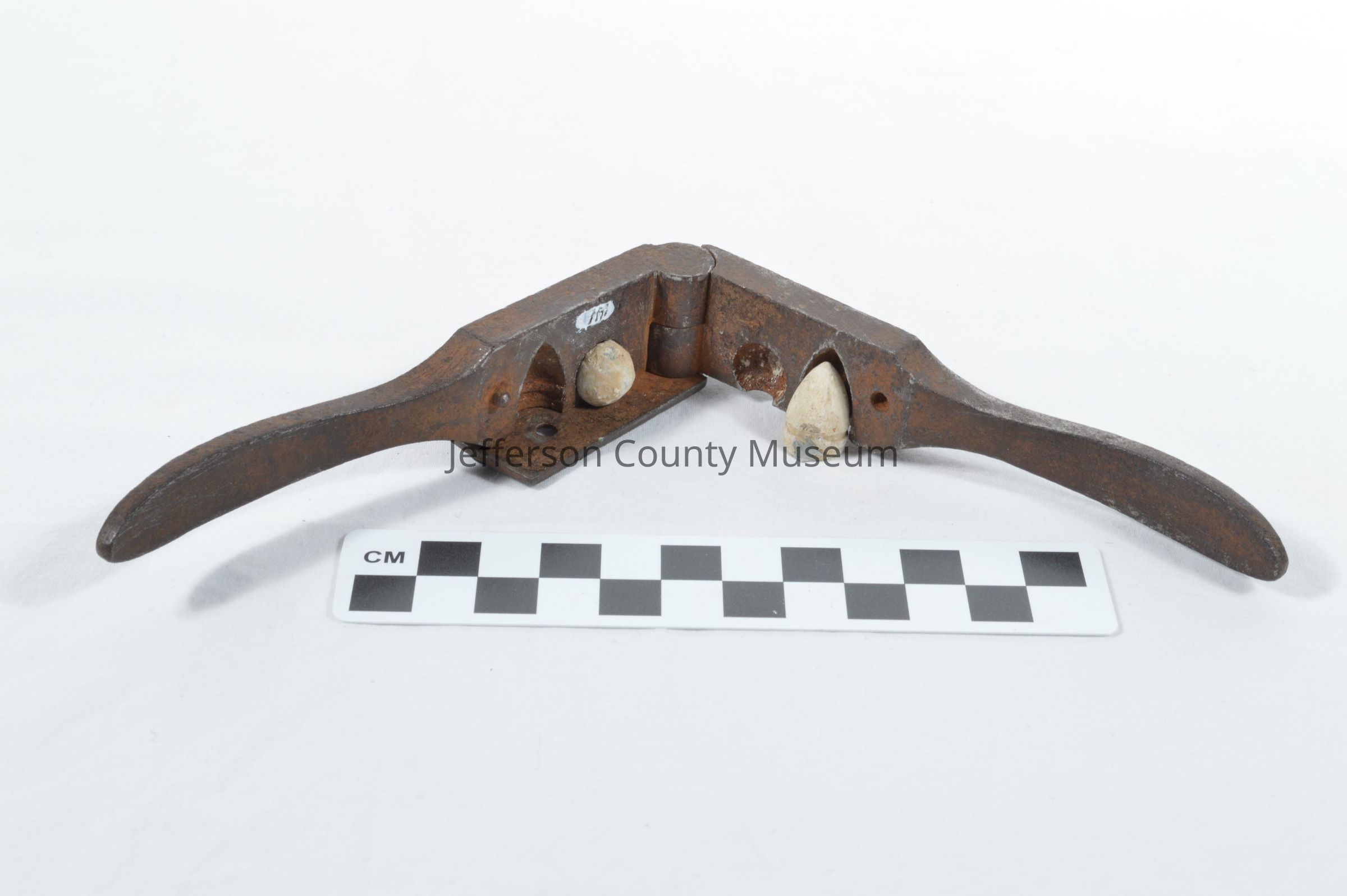 Iron mold with one mold for balls and one for minie bullets. Lead minie ball (Obj #2109) inside mold. Opens and closes like pliers.Acquisition