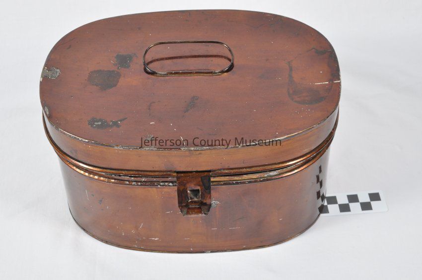 Oval shaped dark bronze colored lacquered tin box for carrying epaulets catalog number 146. There is a small inner oval box. Belonged to Colonel Israel Robinson, Confederate States of America. Was in 67th Regiment, Virginia Militia.Acquisition