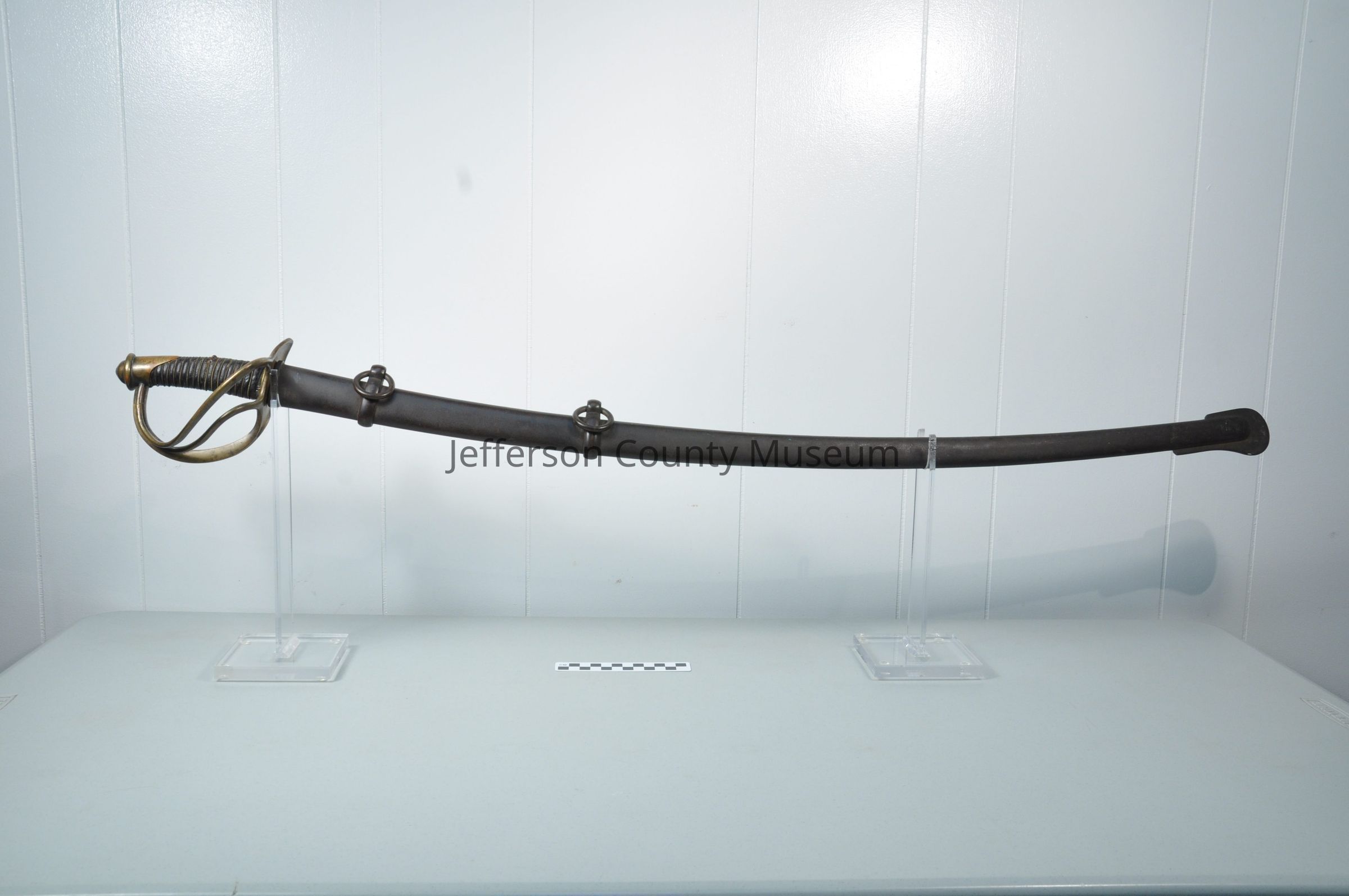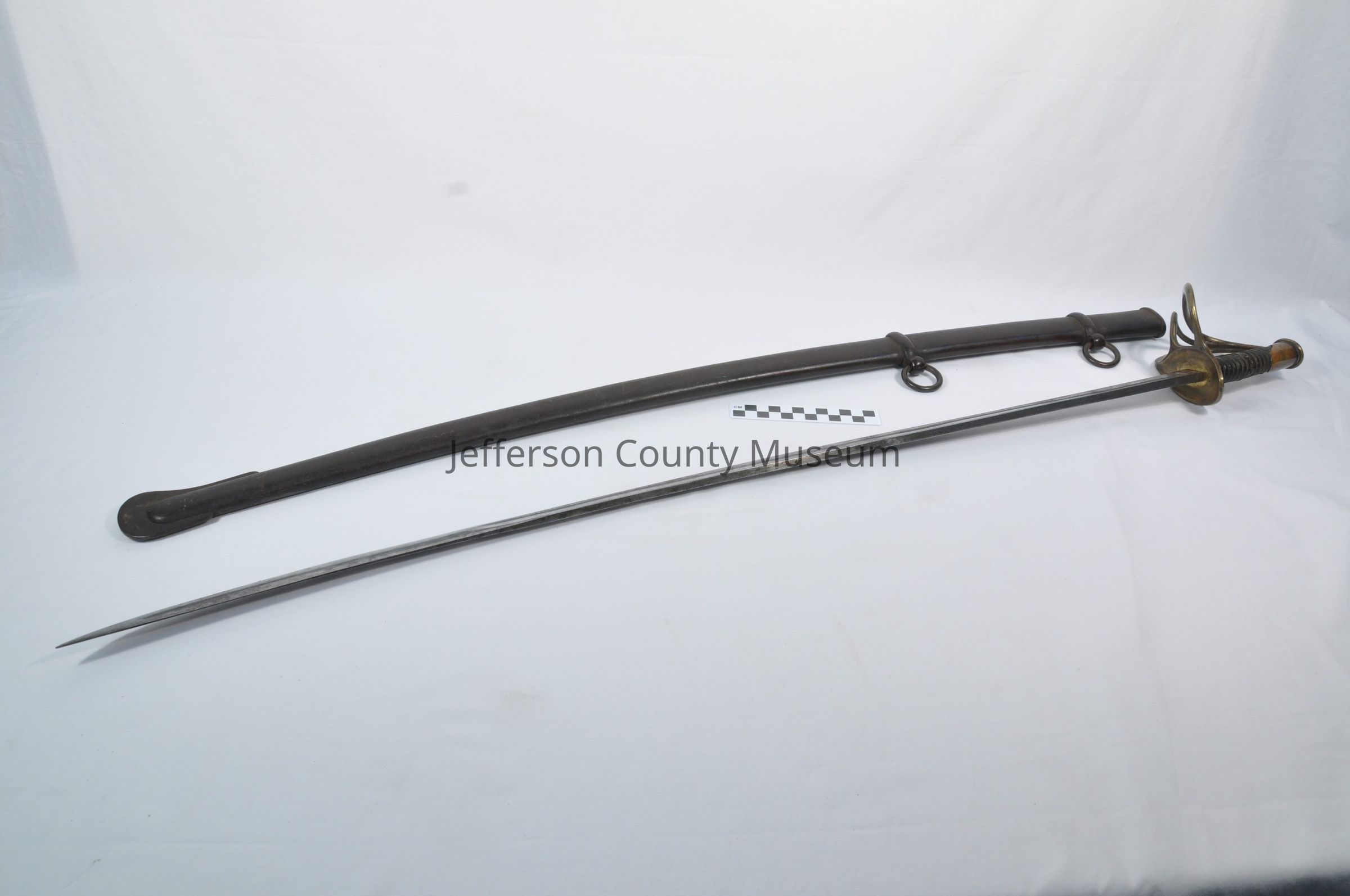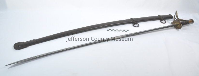 Cavalry sword with two-ring scabbard. Made by W. H. Horstman, Philadelphia, 1840-1850. Has basket-type brass hand guard. Handle of sword is wrapped with leather.