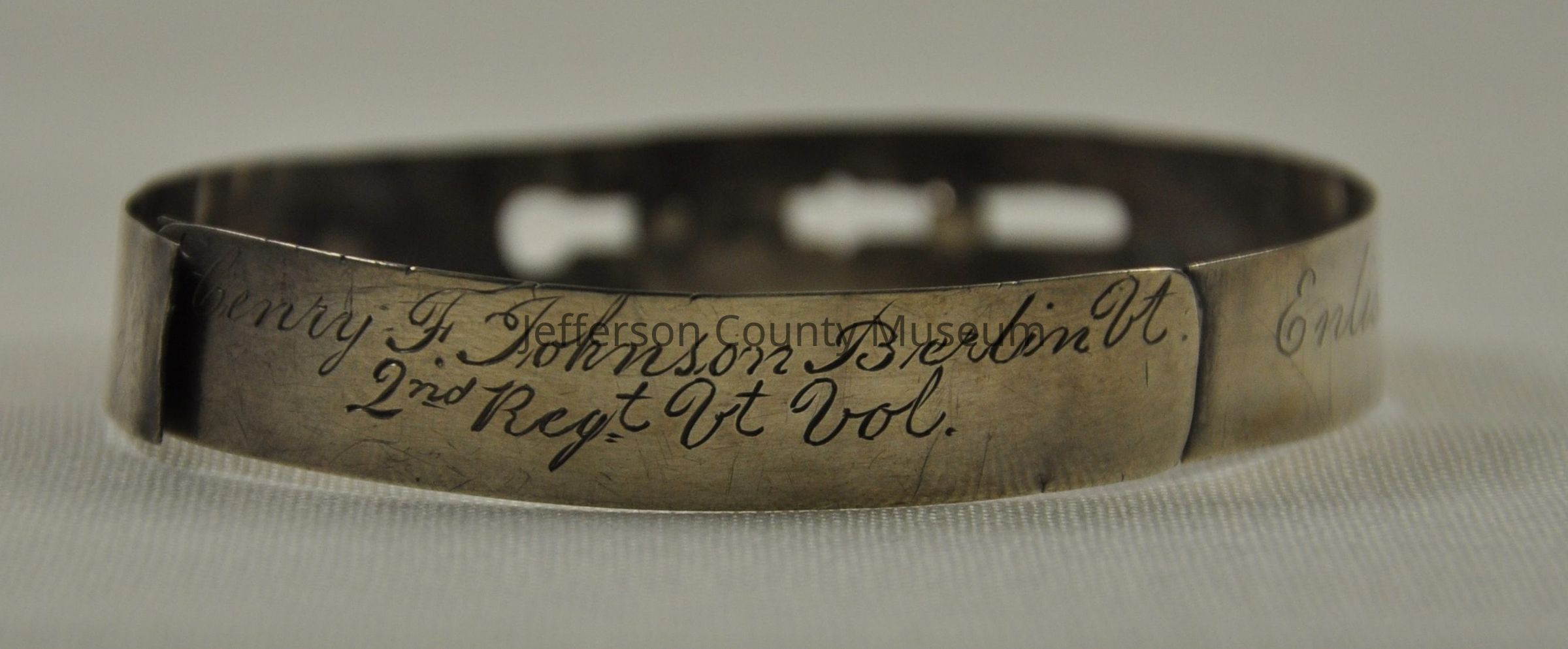 Silver colored metal bracelet inscribed "Henry F. Johnson Berlin VT. enlisted Aug. 14th, 1862, Berlin Vermont". All in cursive. Clasp still works.Acquisition