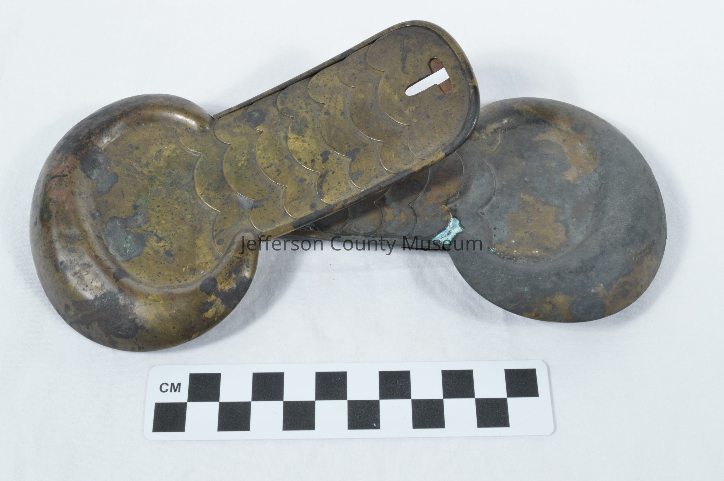 Brass shoulder scales, possibly Civil War era. Clasp and hook at top.