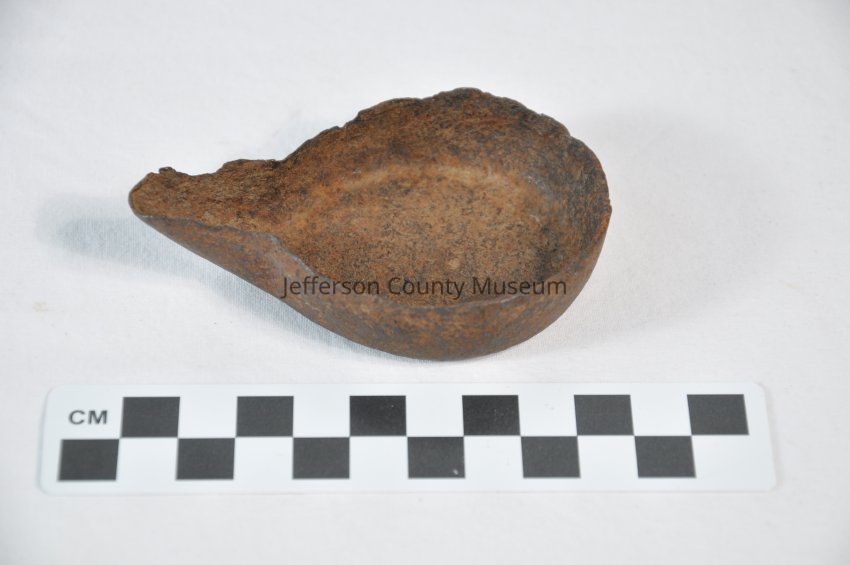 Small iron pan from betty or fat lamp. Spout is extension of pan.Acquisition