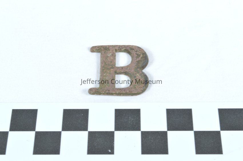 Stamped brass letter "B" for designation of a military company. This item was excavated.Acquisition