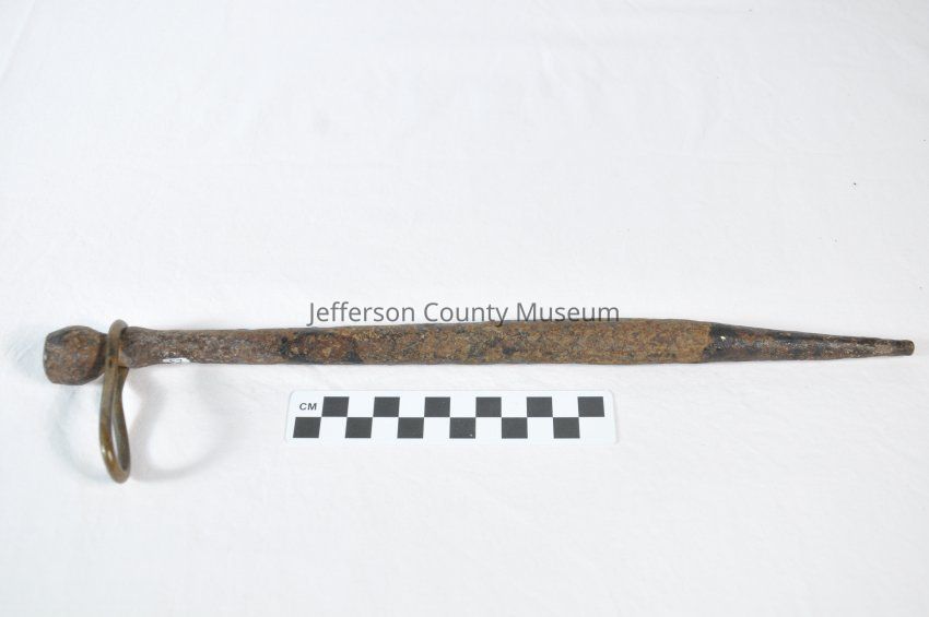 Forged iron picket pin used to tie down horses during the Civil War and after. Heavy loop on top end for tying horses.Acquisition