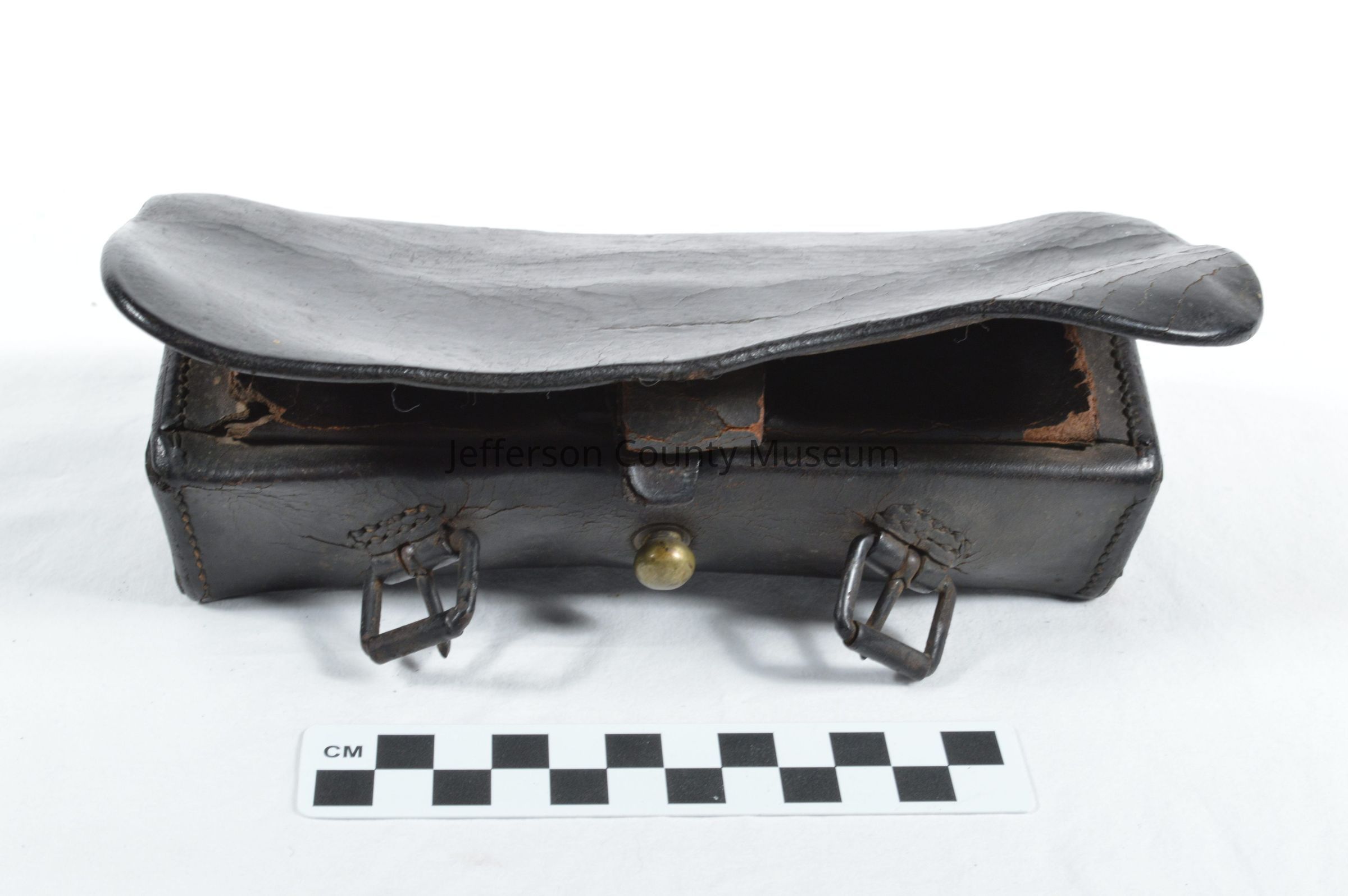 Leather cartridge box, possibly Union Army. Circa 1860. Black leather with brass fittings. Two metal buckles on bottom. Pieces of straps inside box.Acquisition