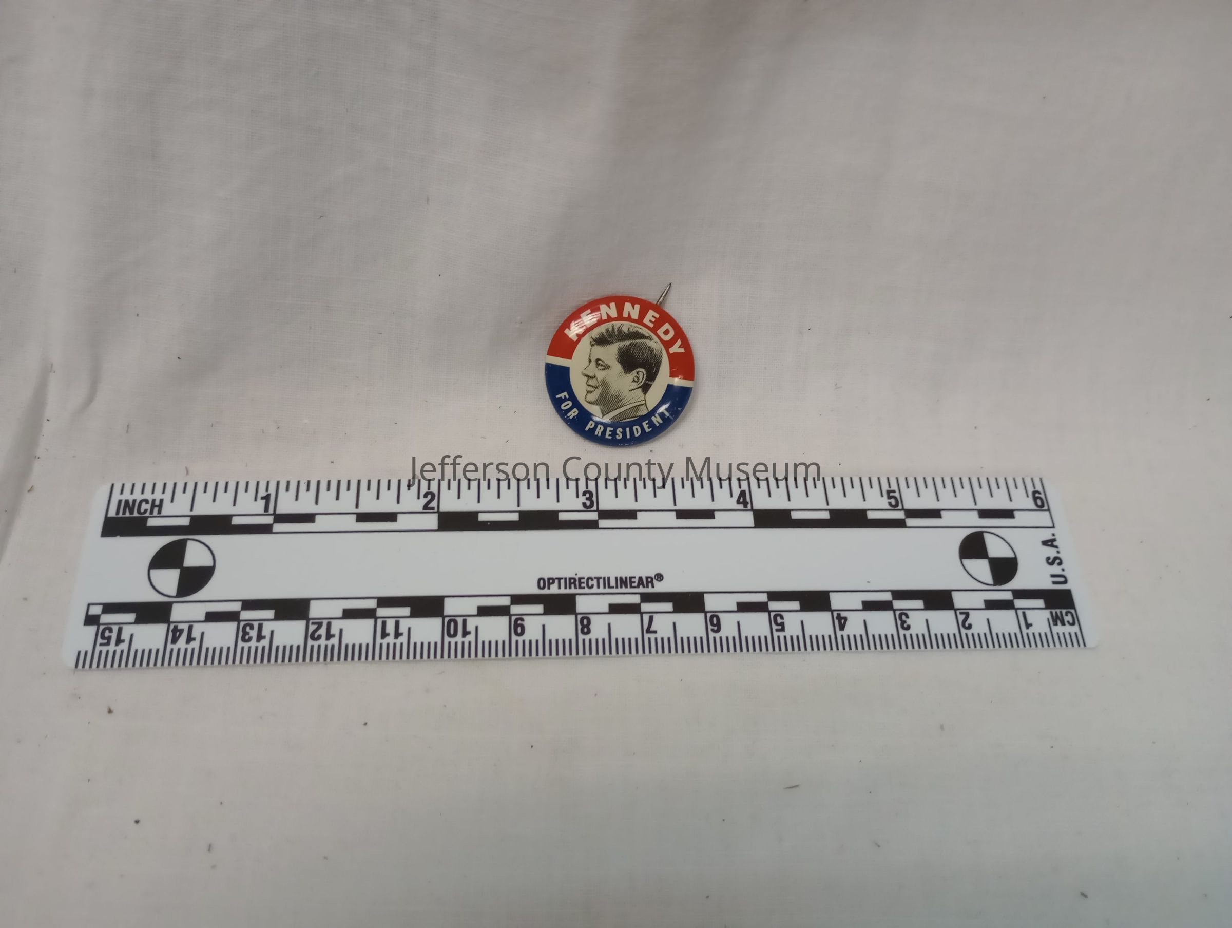 Circular red and blue button with a profile image of John F. Kennedy with the text "KENNEDY FOR PRESIDENT"Context