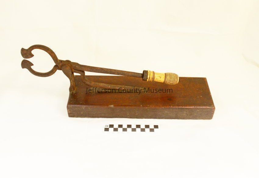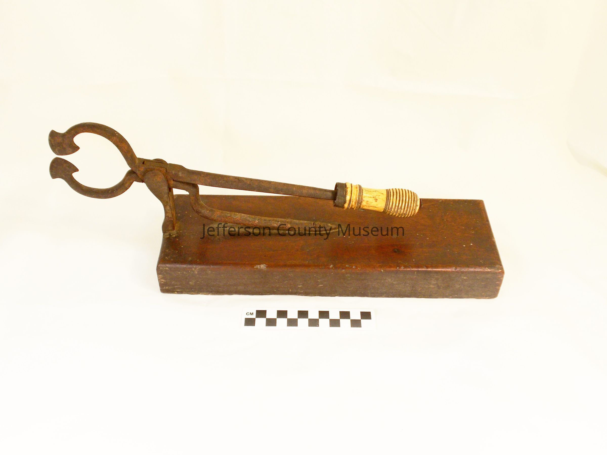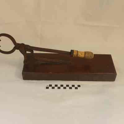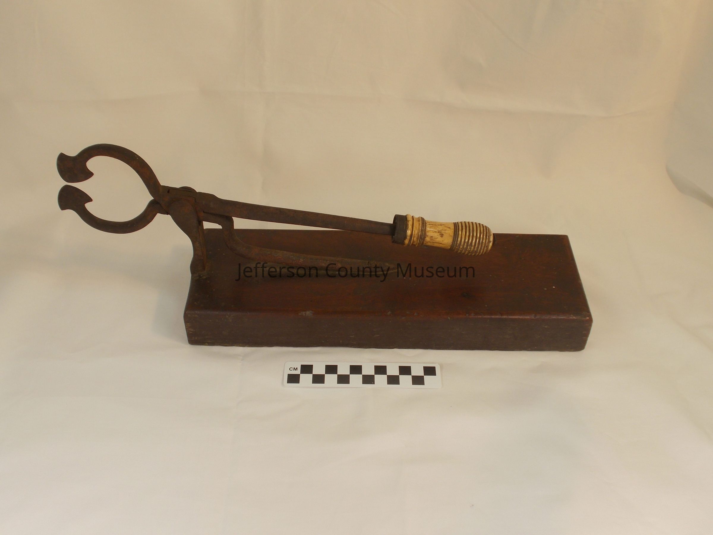 Iron sugar cutter shaped like tongs, with ivory handle mounted on a wooden block. Circa 1800-1820.Acquisition