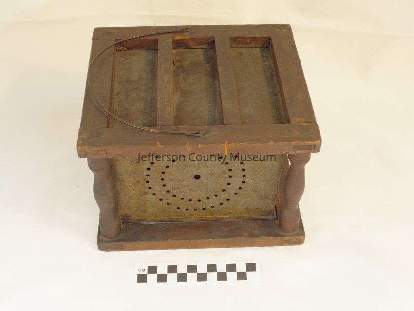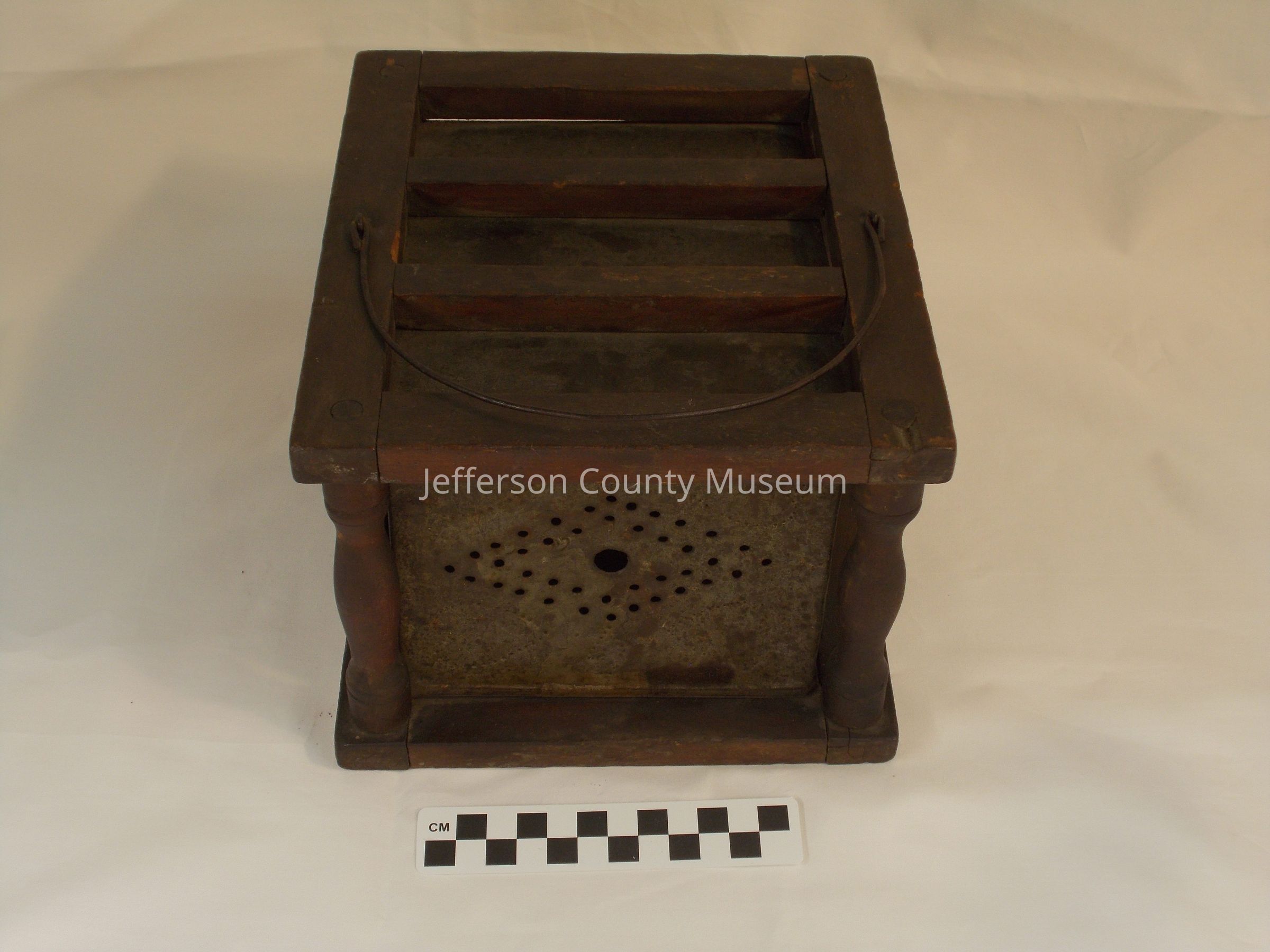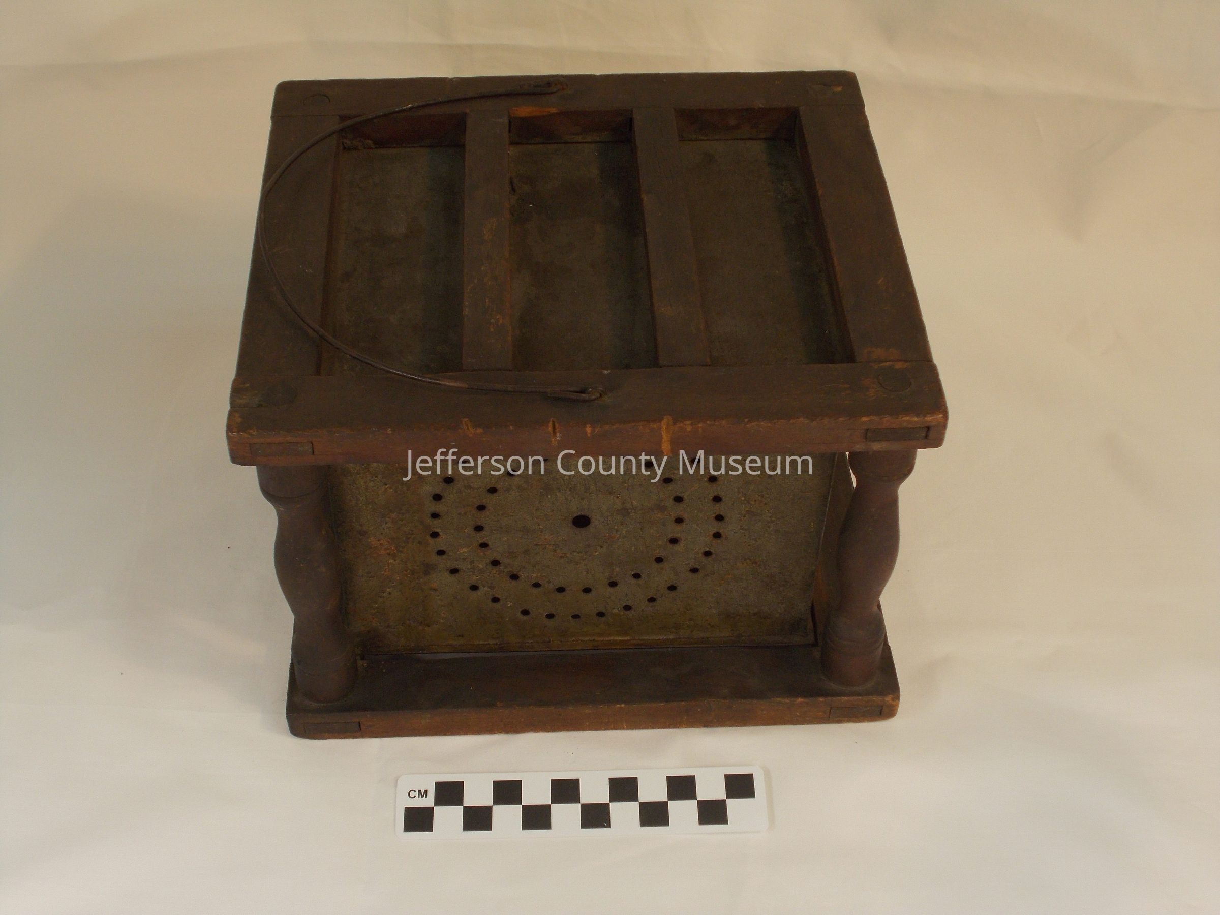 Tin and wood foot warmer with rare punched decoration in metal. Door has holes punched in shape of hand with fingers holding latch. Wire handle for carrying. American, circa 1830-1850.Acquisition